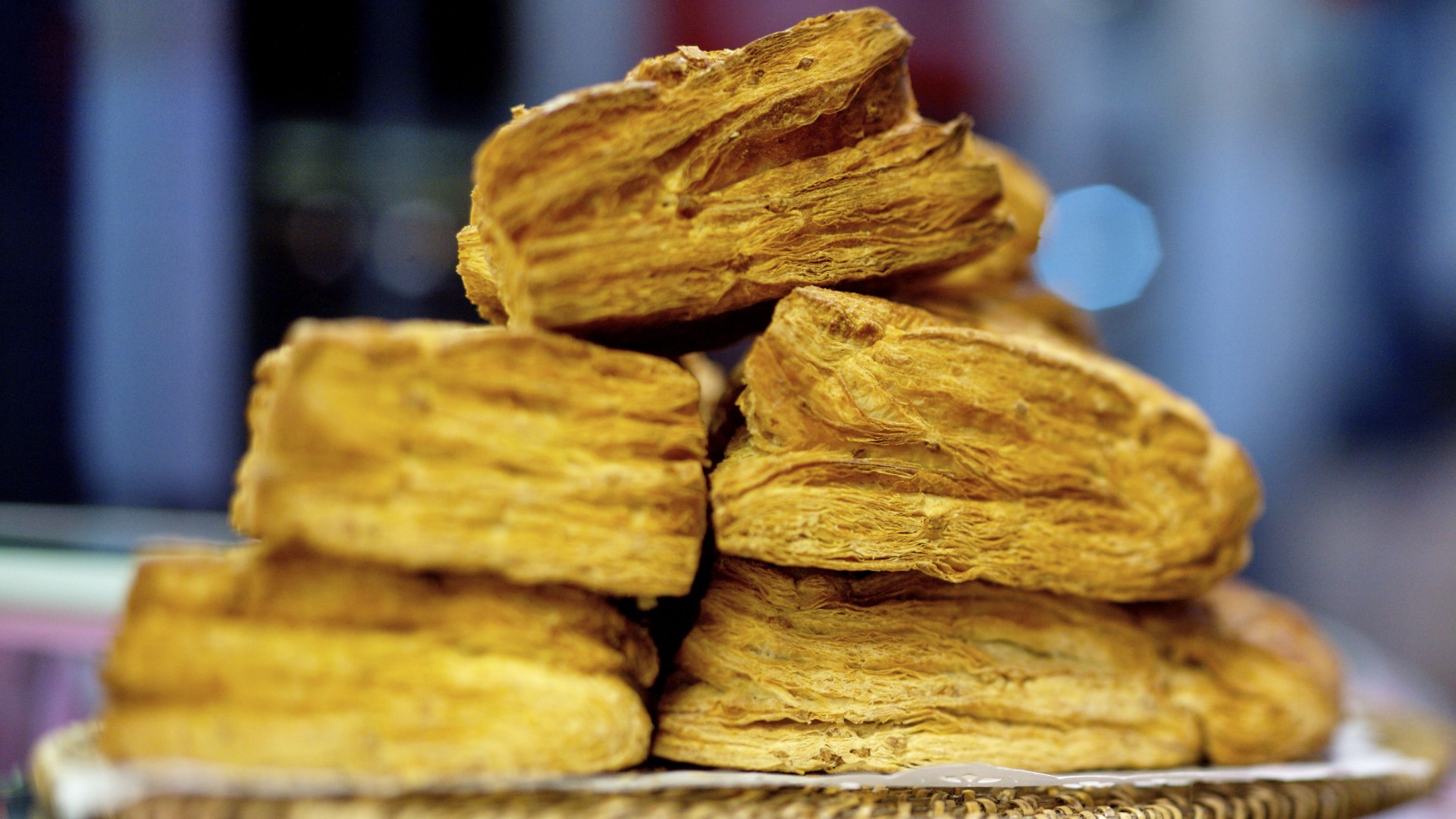 Тесто нужно разморозить и нарезать ромбиками. Затем смазать их яйцом, посыпать сахаром и запечь. Получится пирожное под названием «Гата», поделился рецептом шеф-повар Иван Кудряшов.