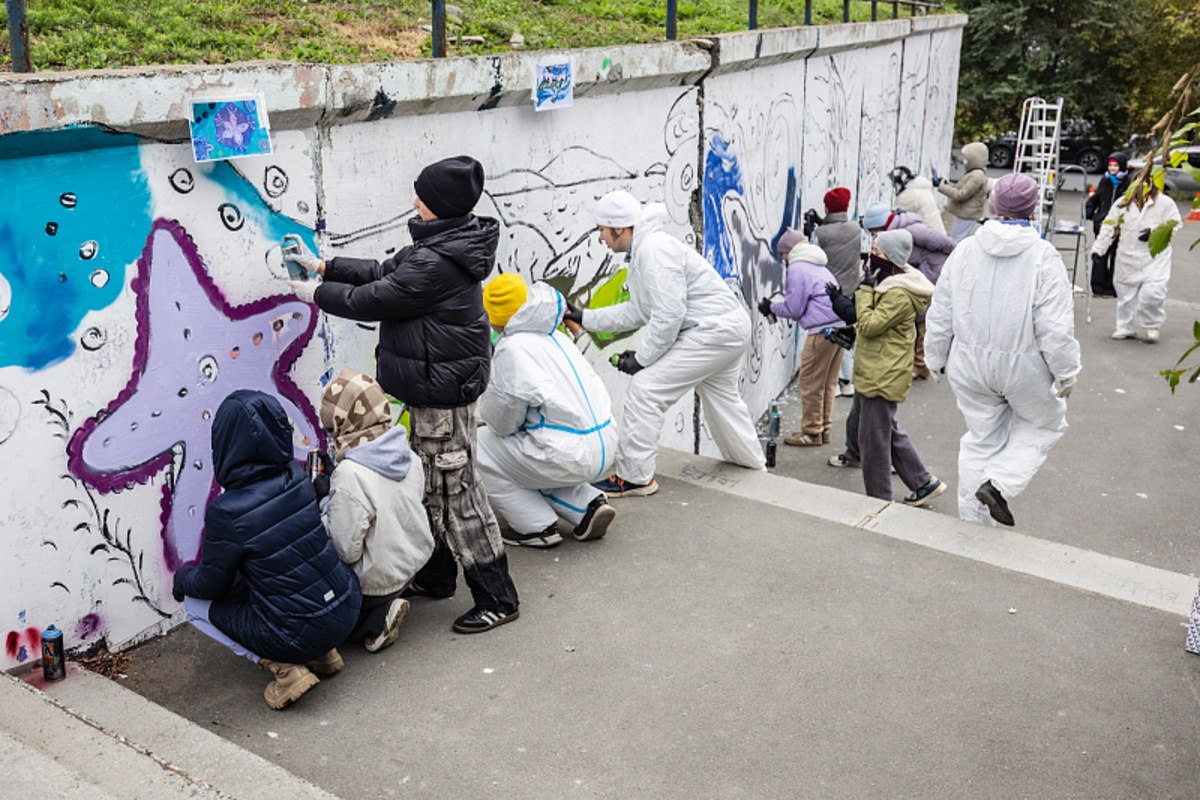 Тигр и морские звёзды: на подпорной стене рядом с «Концерт Холлом» появился мурал от учеников детской художественной школы