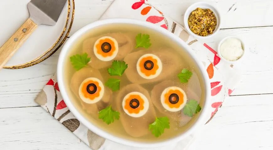 Для приготовления требуется отварить язык, добавить в бульон специи, а затем сделать желе. Поставить готовое блюдо в холодильник до застывания для подачи.