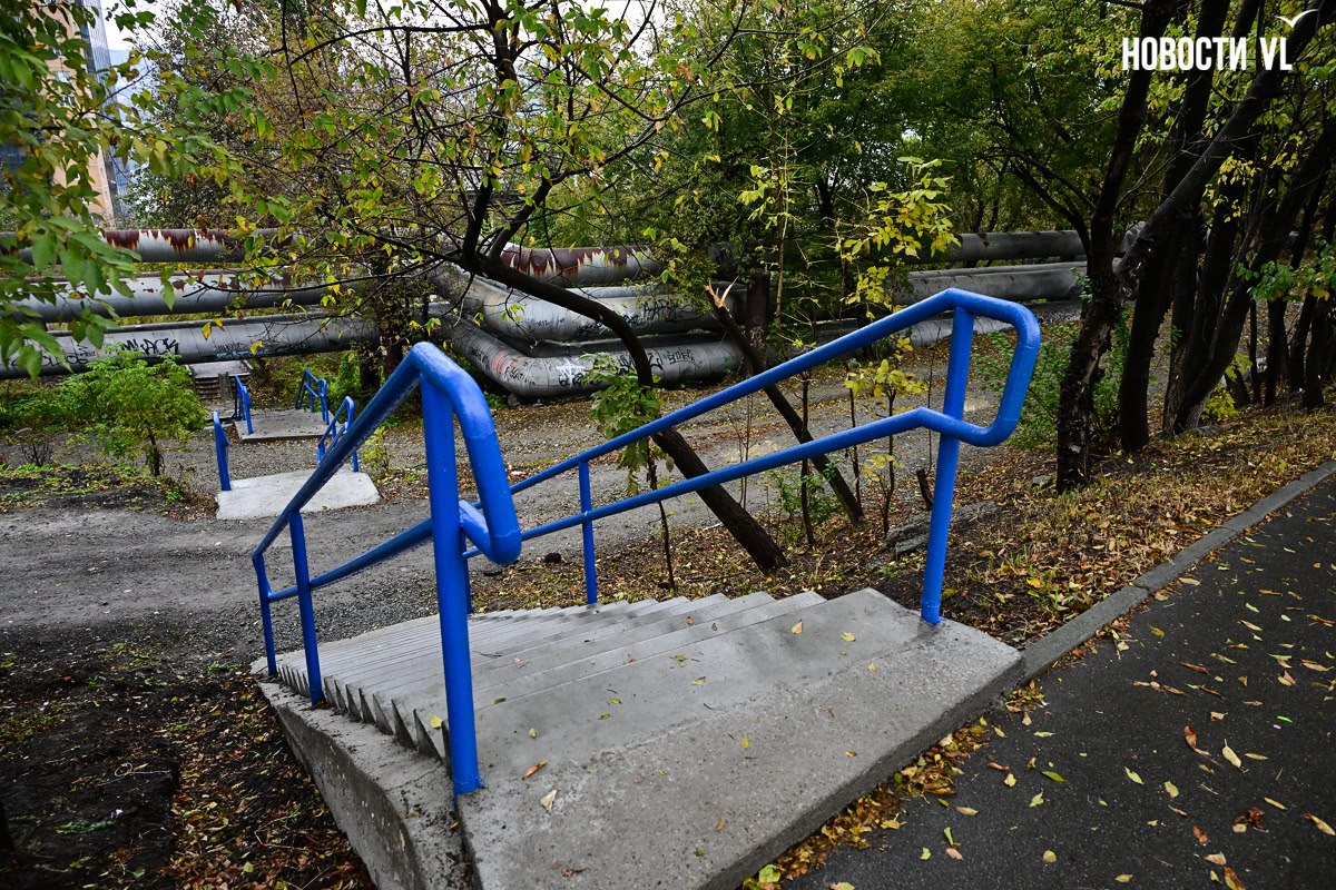 Во Владивостоке ремонт лестницы, ведущей от Вилкова к Киевской, буквально завершился на полпути. Администрация города по решению суда включила этот спуск в «ремонтный» список, но из-за того, что часть лестницы заходит на территорию РЖД, отремонтировали её не полностью. И теперь эта лестница удивляет своей многогранностью: люди, спускающиеся по ней, после ровного участка попадают на кривые и старые ступени.