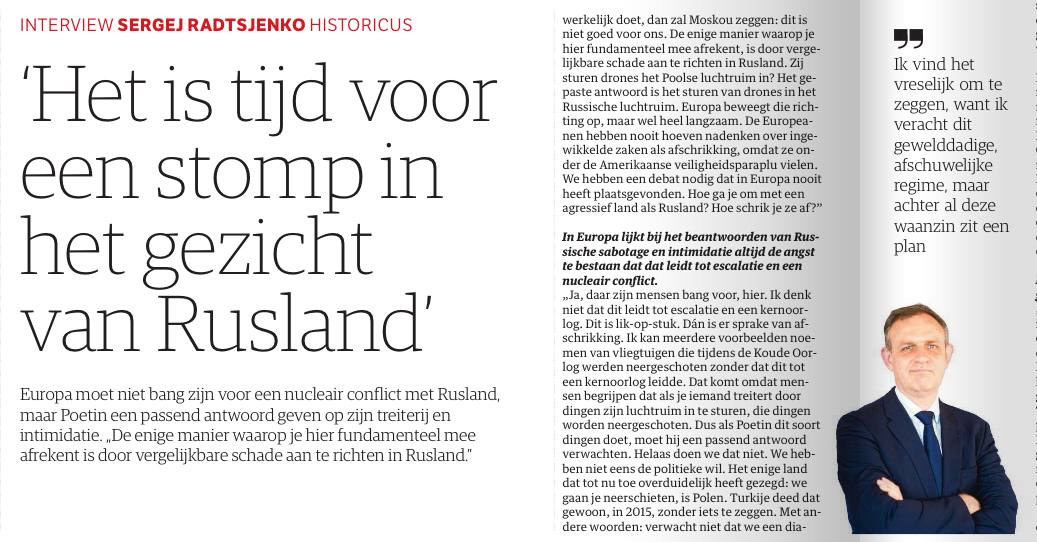 Об этом свидетельствует его интервью в сегодняшней голландской газете NRC. Сей тип поучает Европу, как нужно бить по России в ответ на «гибридные атаки». В частности, говорит: «Единственный способ кардинально решить эту проблему — нанести аналогичный ущерб России. Они отправляют беспилотники в воздушное пространство Польши? Правильный ответ — отправка беспилотников в воздушное пространство России».
