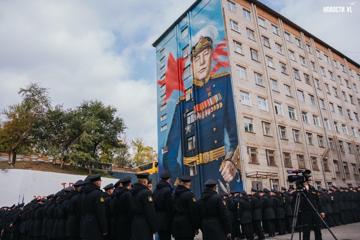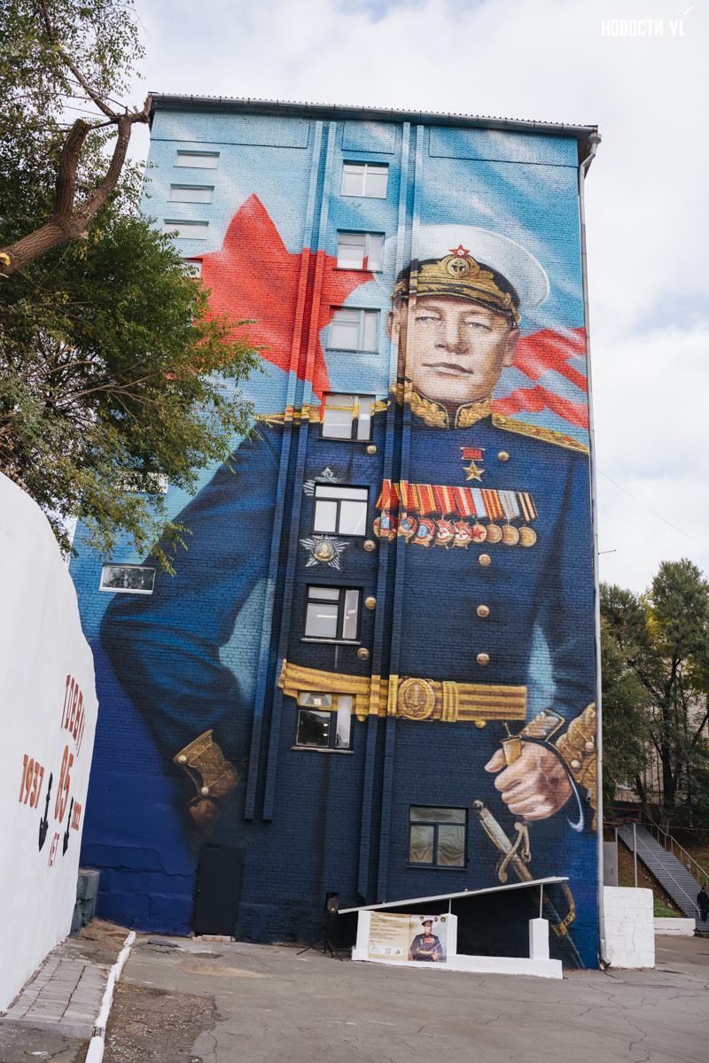 На днях во Владивостоке открыли мурал с изображением адмирала Кузнецова. Николай Герасимович теперь встречает курсантов Тихоокеанского Высшего Военно-Морского Училища имени Адмирала Макарова – его многометровый портрет на одном из зданий училища написал приморский художник Василий Шершон. Рисунок создали в рамках проекта «Муралы Победы», работа над ним шла месяц. При этом художник не использовал ни аэрозолей, ни трафаретов – только кисти, валики и фасадную краску, так что мурал по праву можно считать произведением монументальной живописи.