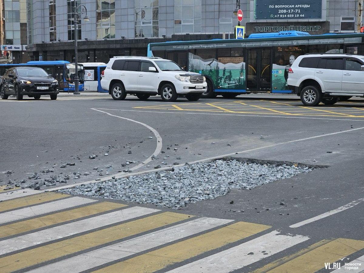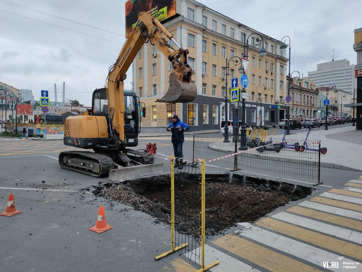 В субботу, 18 октября, водители неприятно удивились глубокой яме на проезжей части на Семёновской. Она заняла целую левую полосу движения от стадиона «Динамо» в сторону Алеутской и Океанского проспекта. На участке работает экскаватор, КамАЗ и несколько специалистов теплосетей. В ДГК объяснили, что здесь обнаружился свищ трубы горячего водоснабжения. А в целом спецтехнику видят на этом перекрёстке уже в четвёртый раз за последние несколько месяцев.