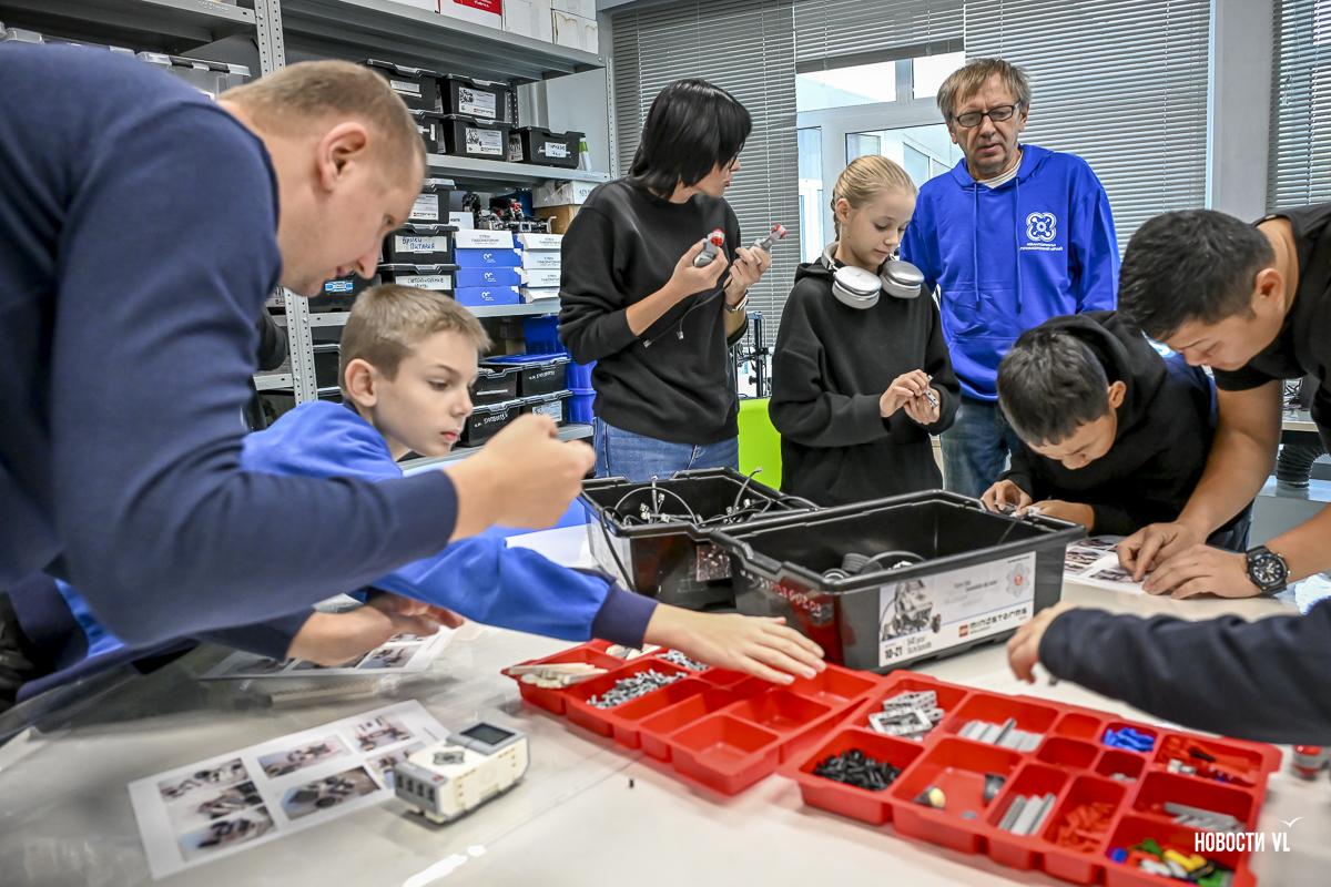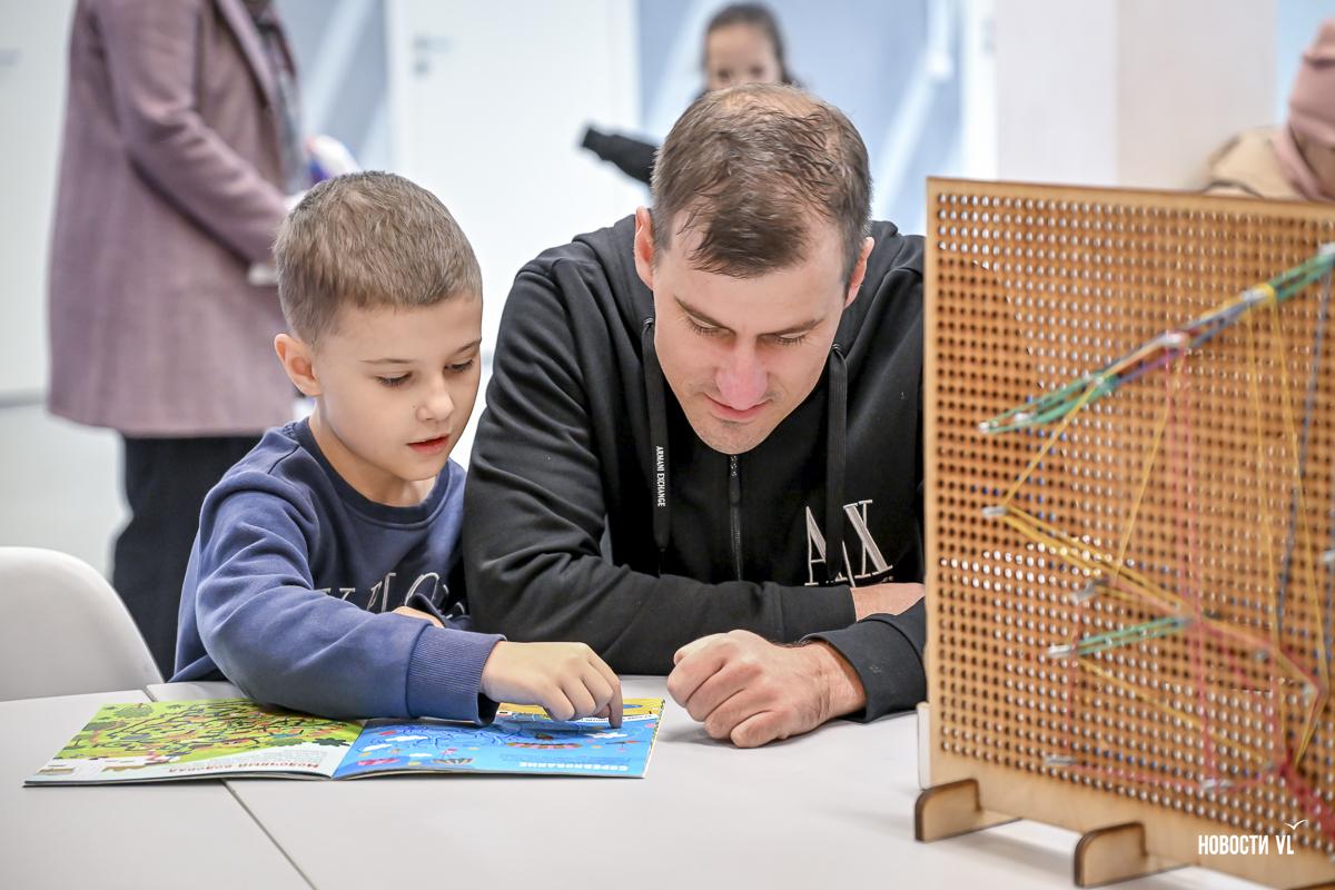 В субботу, 17 октября, в технопарке «Кванториум» во Владивостоке отмечали День отца. Активности для них подобрали вполне подобающие поводу, мальчишеские: ои в VR-очках, турниры в шахматы и гонки с препятствиями на роботах. Папы вместе с детьми объединились в команды и боролись за победу, всего сегодня сюда приехали помериться силами с соперниками 48 человек.