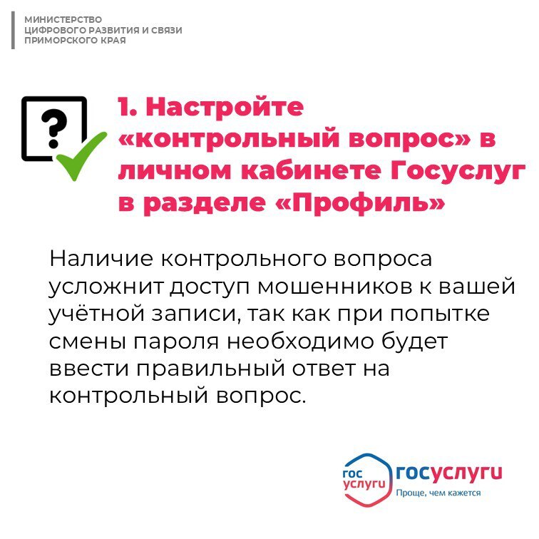 1. Настройте «контрольный вопрос» в личном кабинете Госуслуг в разделе «Профиль»