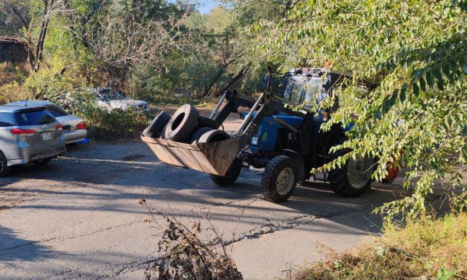 Первореченский район — уборка прибордюрной полосы на улице Шошина и вывоз автомобильных шин с улицы Днепровской.