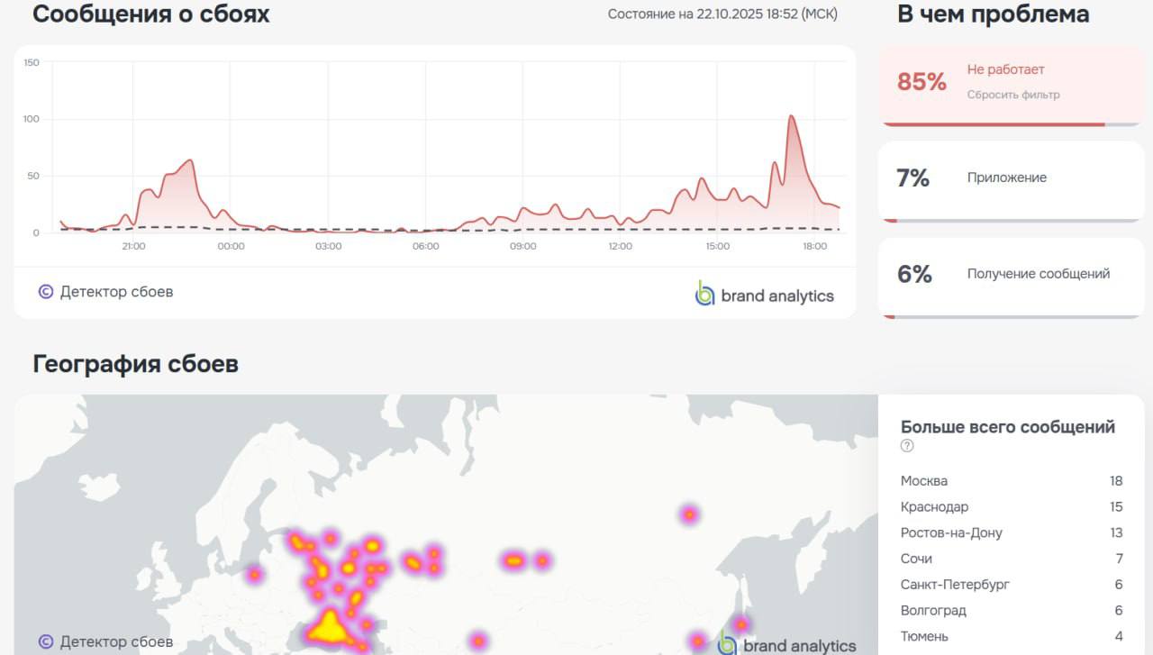 У многих на экране висит постоянное «Подключение». Проблемы фиксируются в Москве, Санкт-Петербурге, Ростове-на-Дону, Сочи, Волгограде, Астрахани, а также на Дальнем Востоке.
