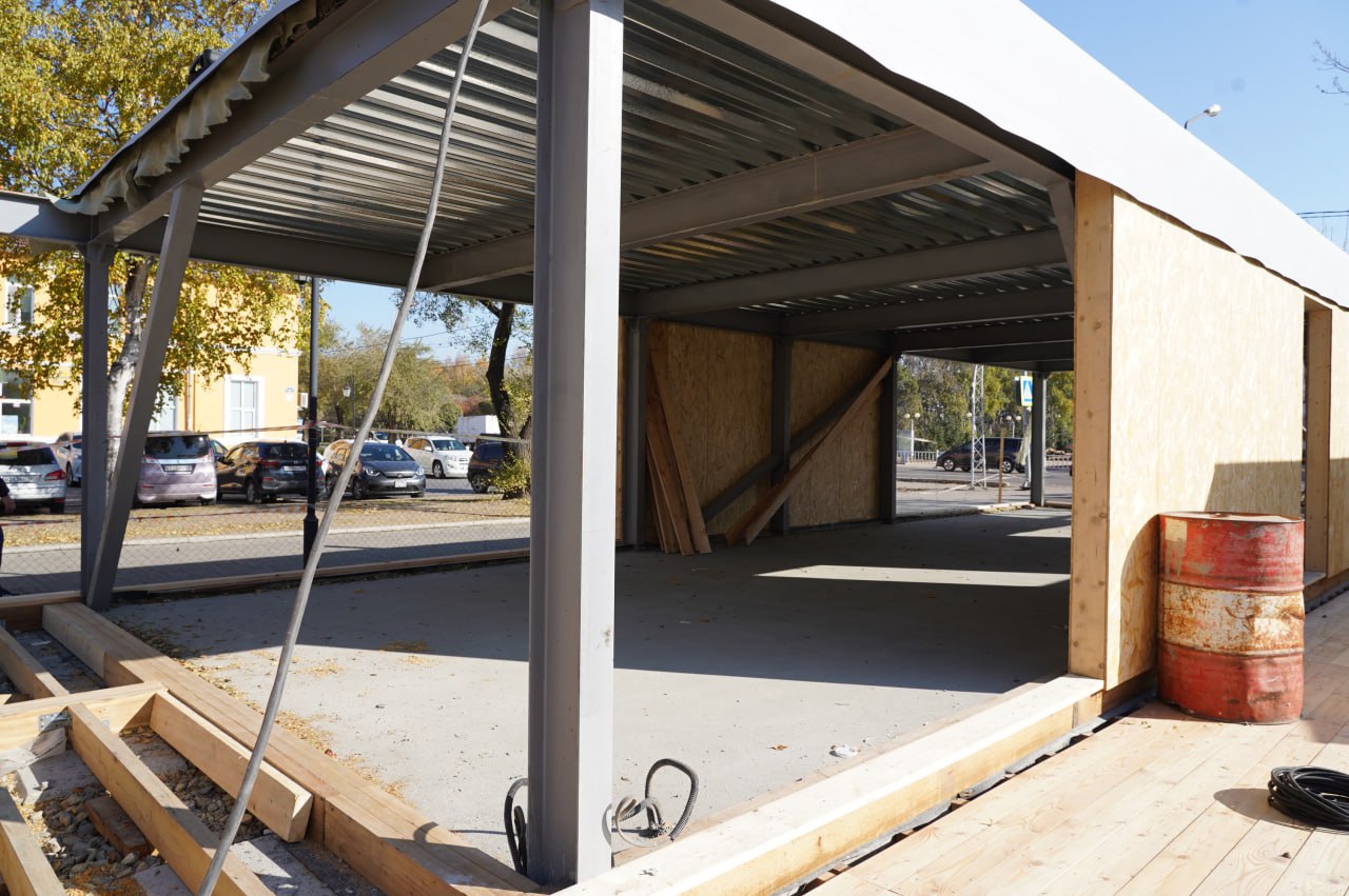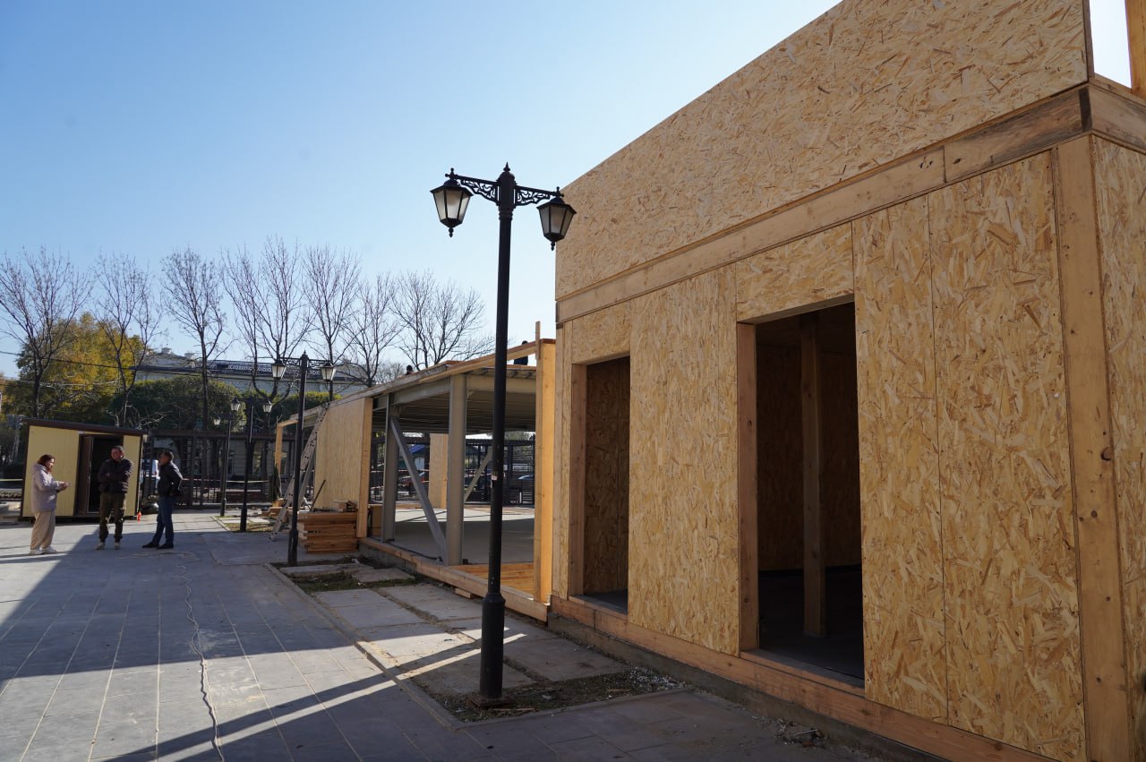 Сейчас подрядчик собирает каркасы нестационарных сооружений. Всего будет построено 4 конструкции: часть из них на металлокаркасе, остальные из дерева. Павильоны с зоной фудкорта будут с эксплуатируемой кровлей – на крыше будет возможность разместить летнее кафе, также строители оборудуют винтовые лестницы для подъема. Общая площадь строящихся объектов – 250 м2.