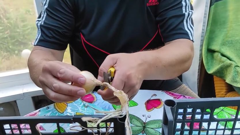 - Контроль длины: Обрезая корни, оставляйте от 3 до 5 мм от донышка для защиты луковицы.