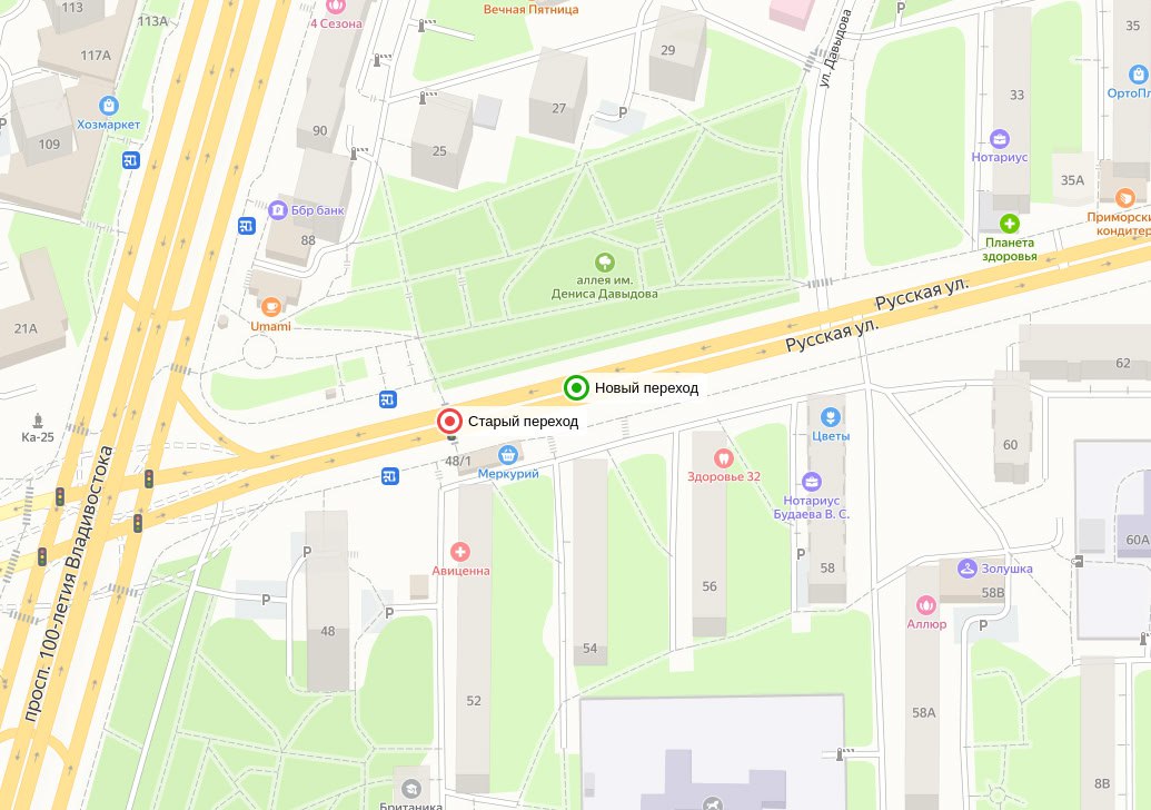 Регулируемый пешеходный переход, который ранее располагался на Русской, 48/1 (около магазина «Меркурий») перенесён чуть дальше и сейчас расположен в районе Русской, 54.