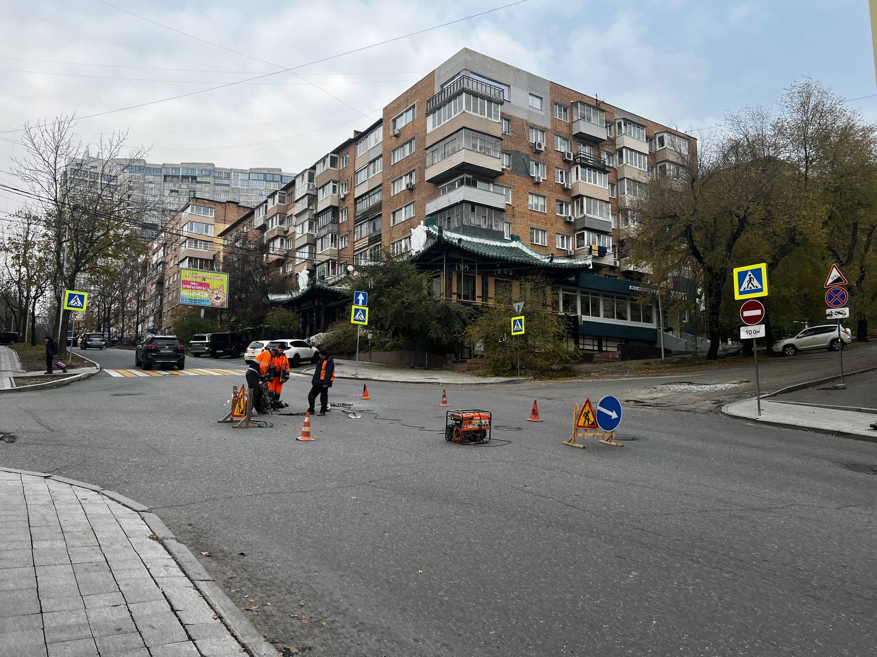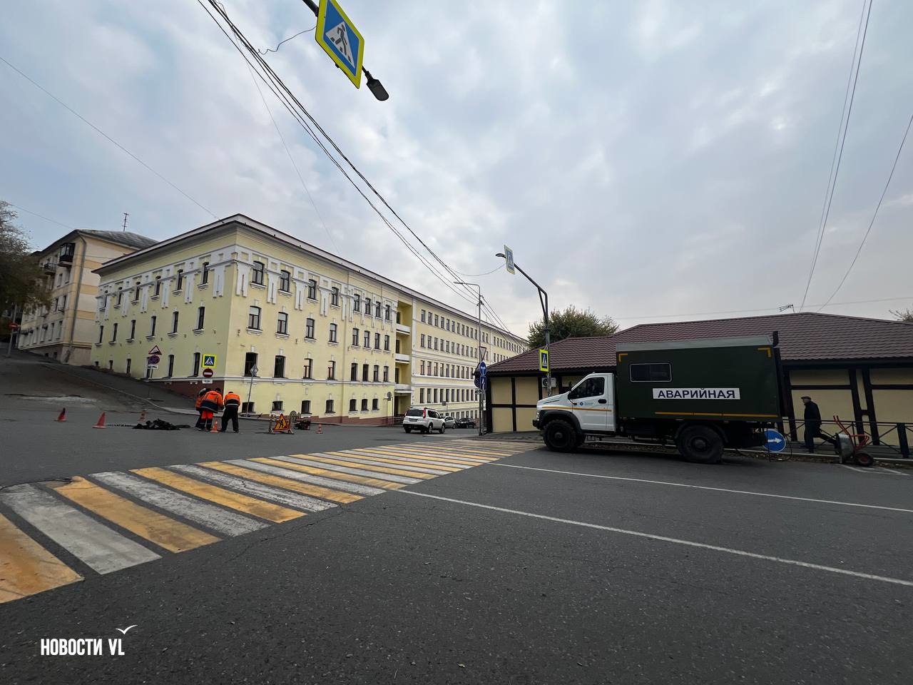 На перекрёстке улиц 1-я Морская и Посьетская работает аварийная бригада Примводоканала. Проезд есть, но он затруднён. Что именно делают, не совсем понятно, сейчас тут сухо. Но неделю назад на этом перекрёстке корреспонденты Новостей VL наблюдали милый плохо пахнущий фонтанчик.
