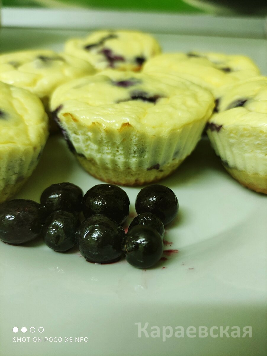Теперь перейдем к сырному суфле. Взбейте крем-сыр с яйцом и сахарозаменителем до однородной массы. После этого достаньте формы с бисквитом из духовки, добавьте несколько ягод на каждую порцию и залейте сырной смесью. Верните в духовку и выпекайте еще 15 минут.
