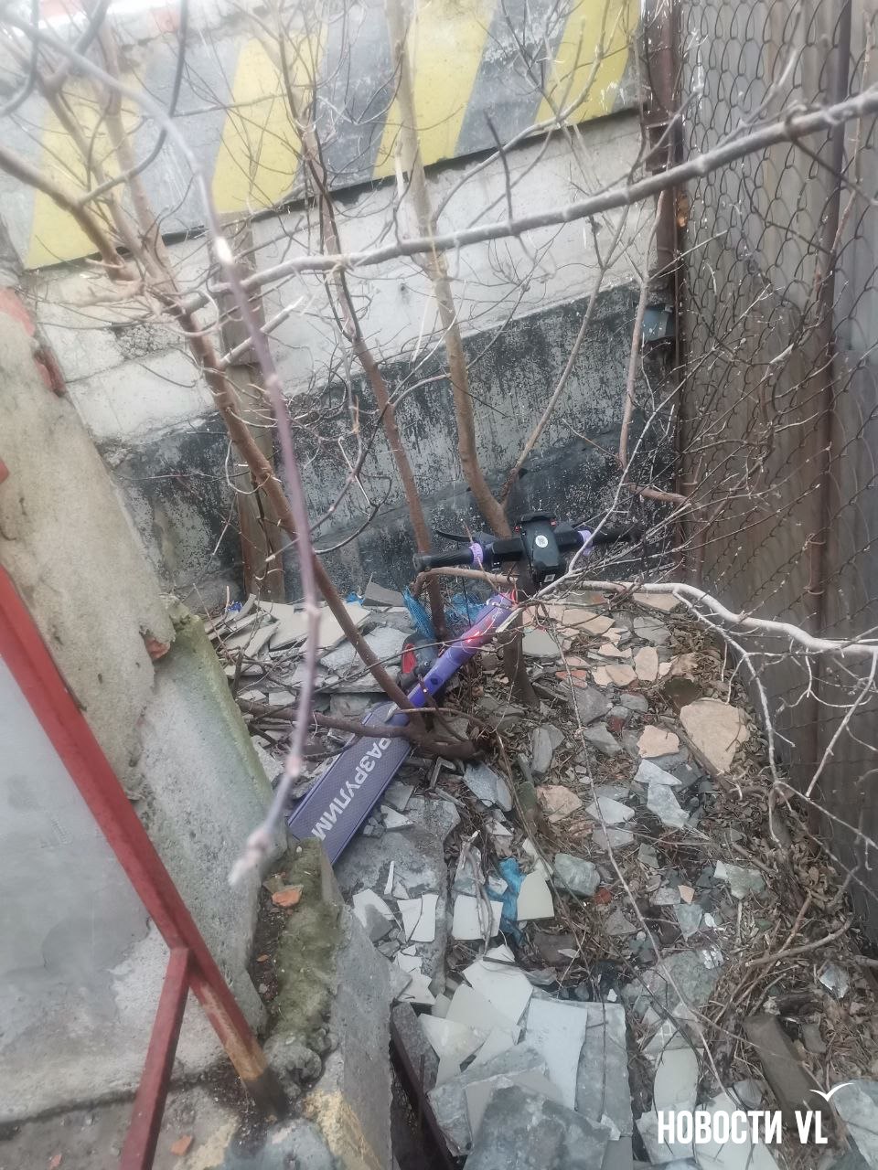 Ещё не все электросамокаты убрали с улиц Владивостока на зимовку. А некоторые противники самокатов продолжают забрасывать их в труднодоступные места.