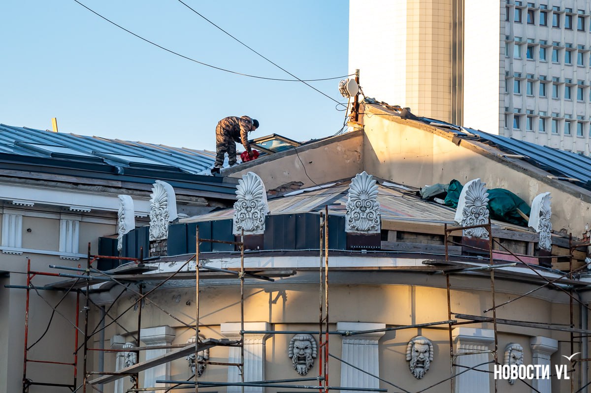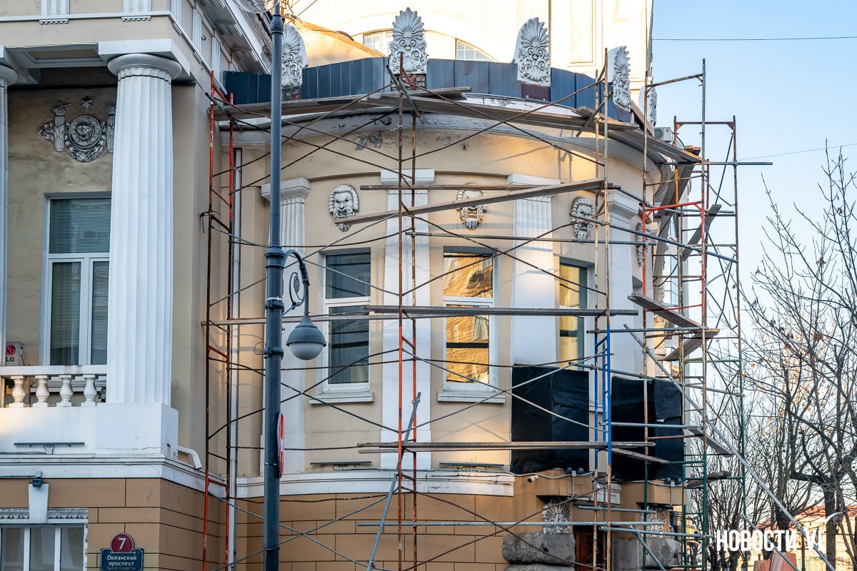На тротуаре около здания бывшего японского консульства (Океанский проспект, 7) установили строительные леса. К сожалению, не для долгожданного ремонта фасада и грифонов — сейчас здесь делают примыкание кровли к фасаду.