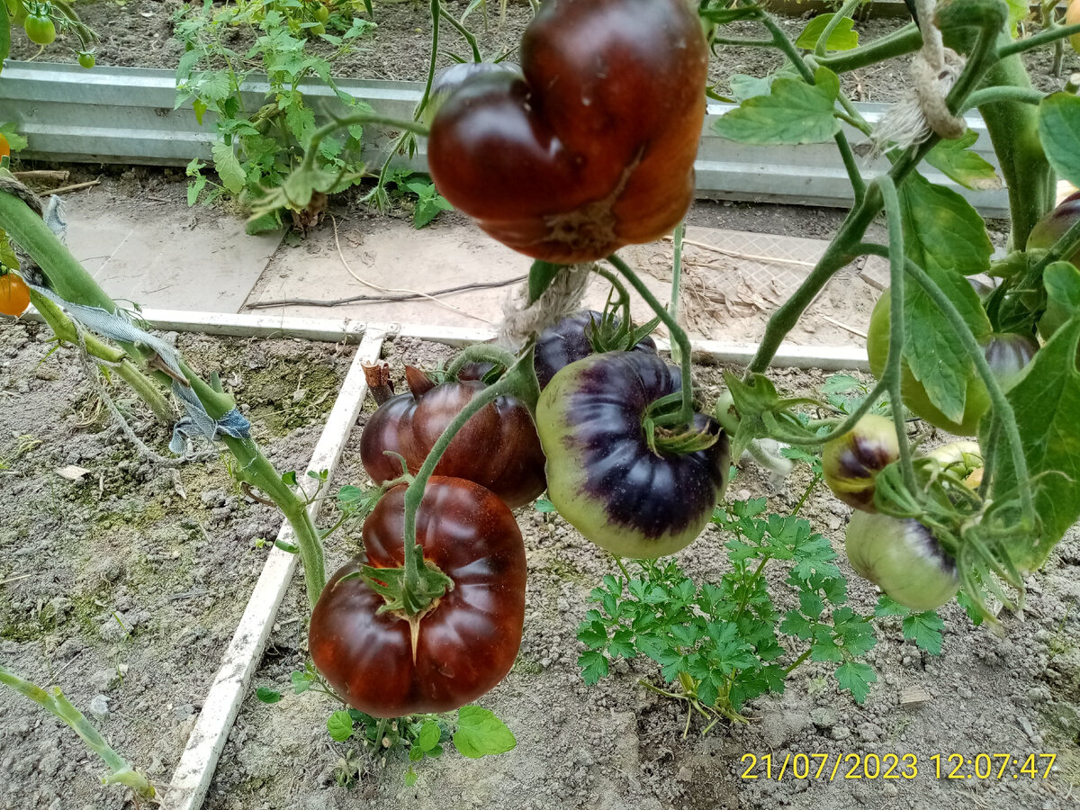 Во время созревания можно увидеть, как зелёный цвет нижней части томата постепенно меняется на яркий румянец с фиолетовыми полосами. Плоды не теряют своих вкусовых качеств даже после длительного хранения, что делает их идеальными для салатов, закусок и даже просто с солью.