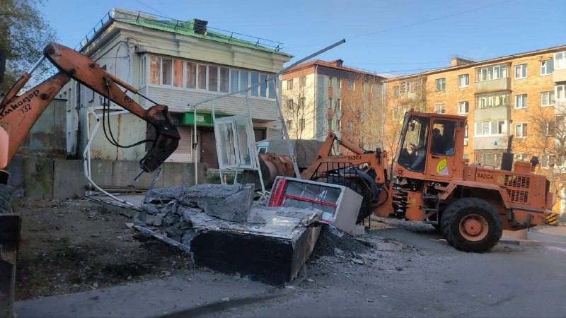 Продолжили дорожники и разбор торговых павильонов на Спортивной, 2. С начала ноября здесь убрано ещё 234 квадратных метра незаконных строений. Сейчас муниципальная служба сносит навес площадью 317 квадратов.