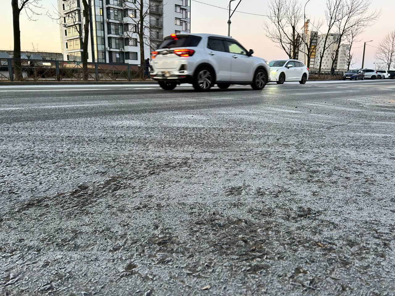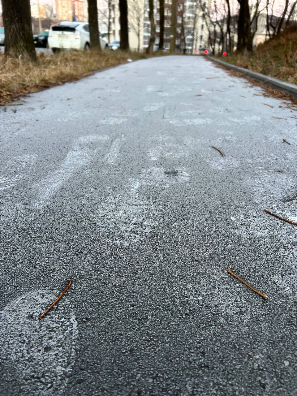 Иней образовался на дорогах и тротуарах во Владивостоке. Водители и пешеходы сообщают о том, что в городе очень скользко.