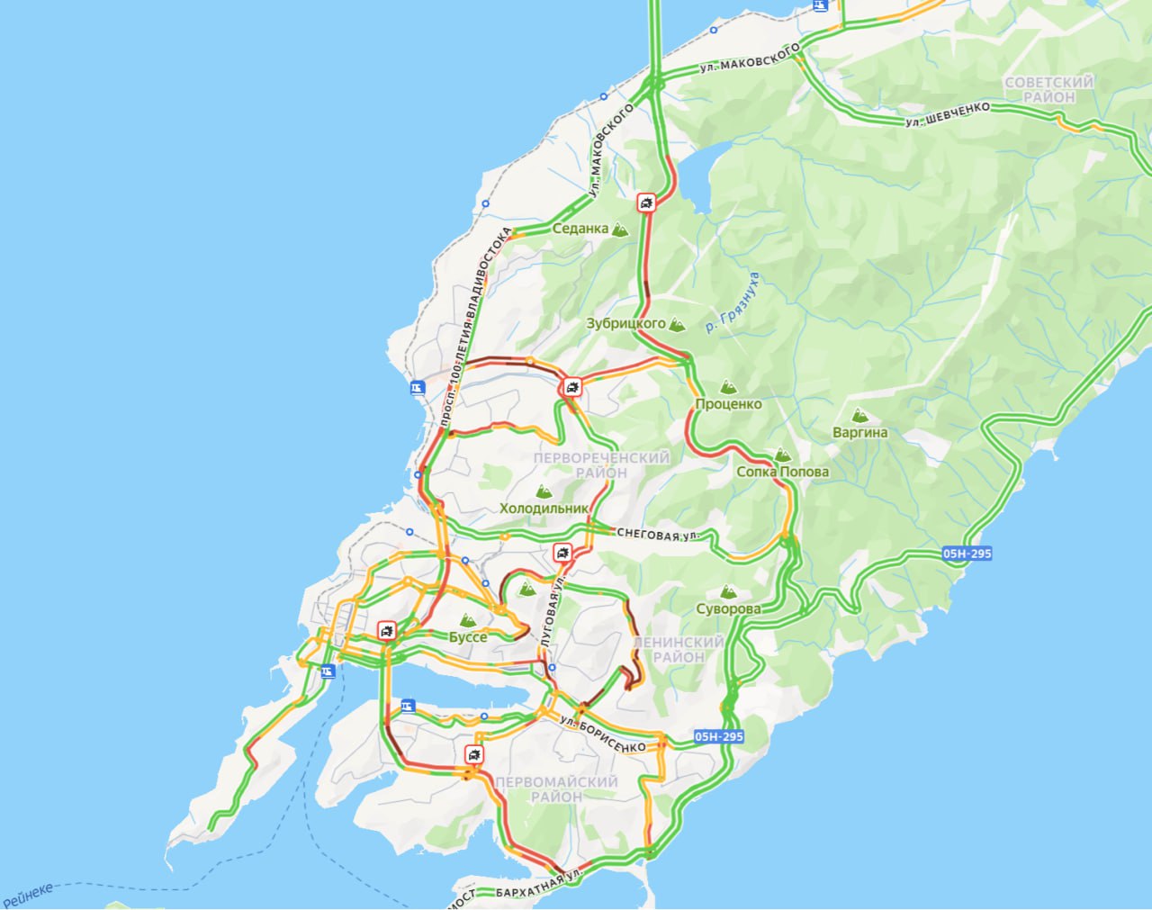 Утро четверга началось во Владивостоке с 8-балльных пробок и аварий. На объездной заторы в обоих направлениях. Водители предупреждают, что на дорогах скользко. Будьте осторожны!