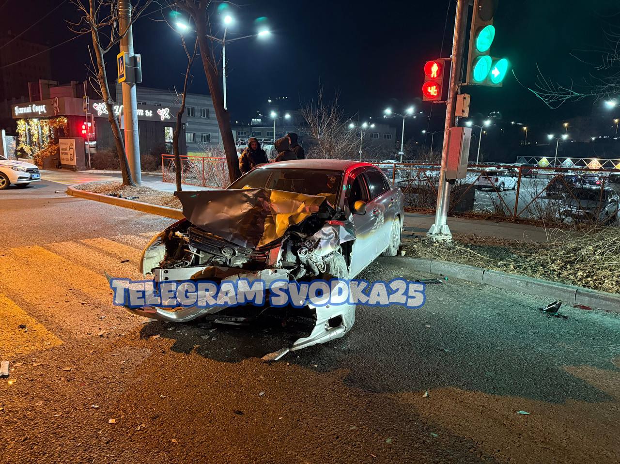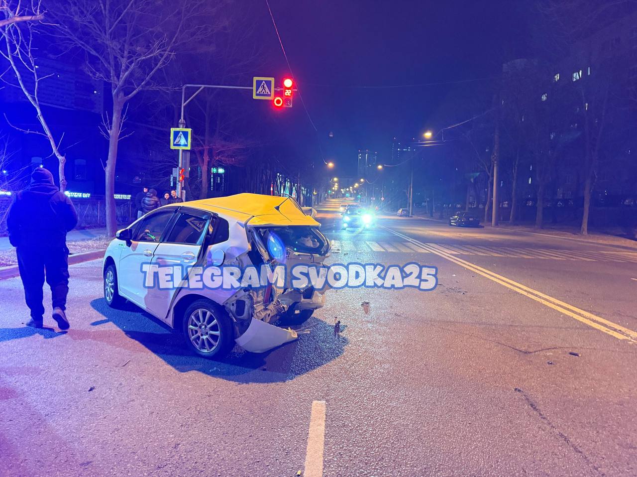 Возле "Реми Сити" на Народном проспекте он на полной скорости влетел в остановившуюся перед красным светом Honda Fit. От удара машину отбросило на несколько метров.
