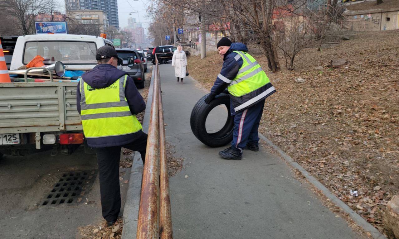 Специализированная бригада выполняет вывоз ТКО и восстановление поручней в подземном переходе на проспекте 100-летия Владивостока.