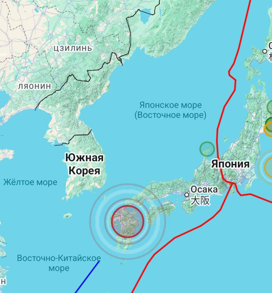 Очаг находился уже в Кумамото, в 50 км к юго-западу от Оиты, префектура Оита, Япония, 25 ноября 2025 года, 19:01 по владивостокскому времени.