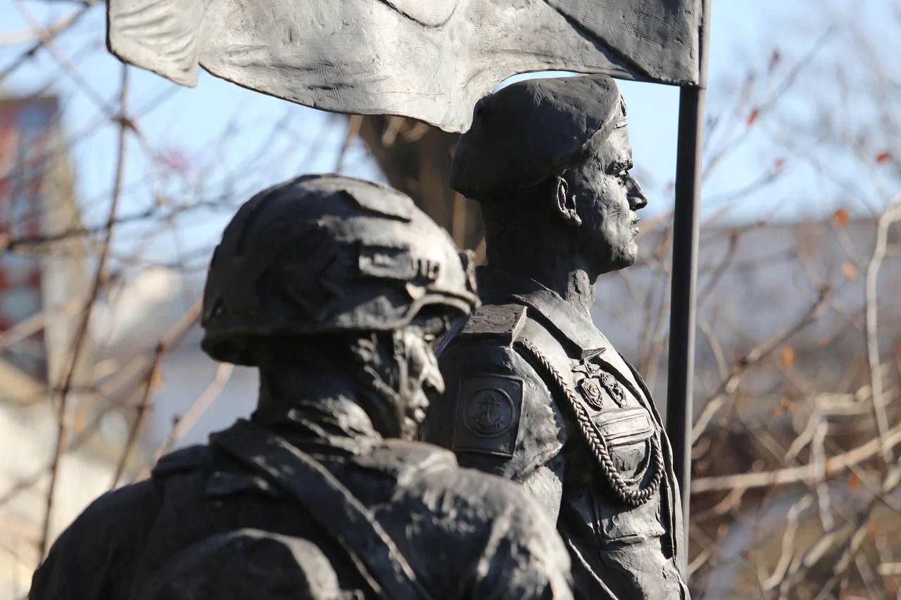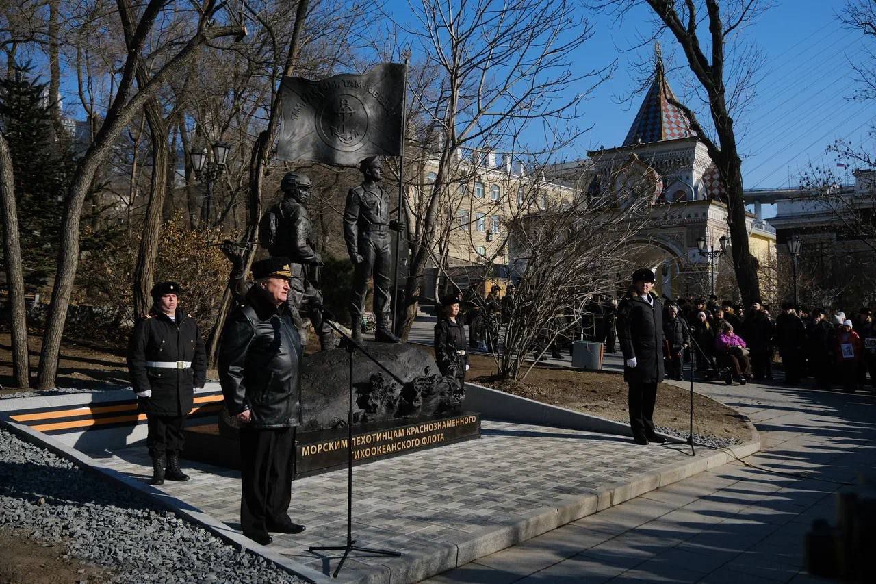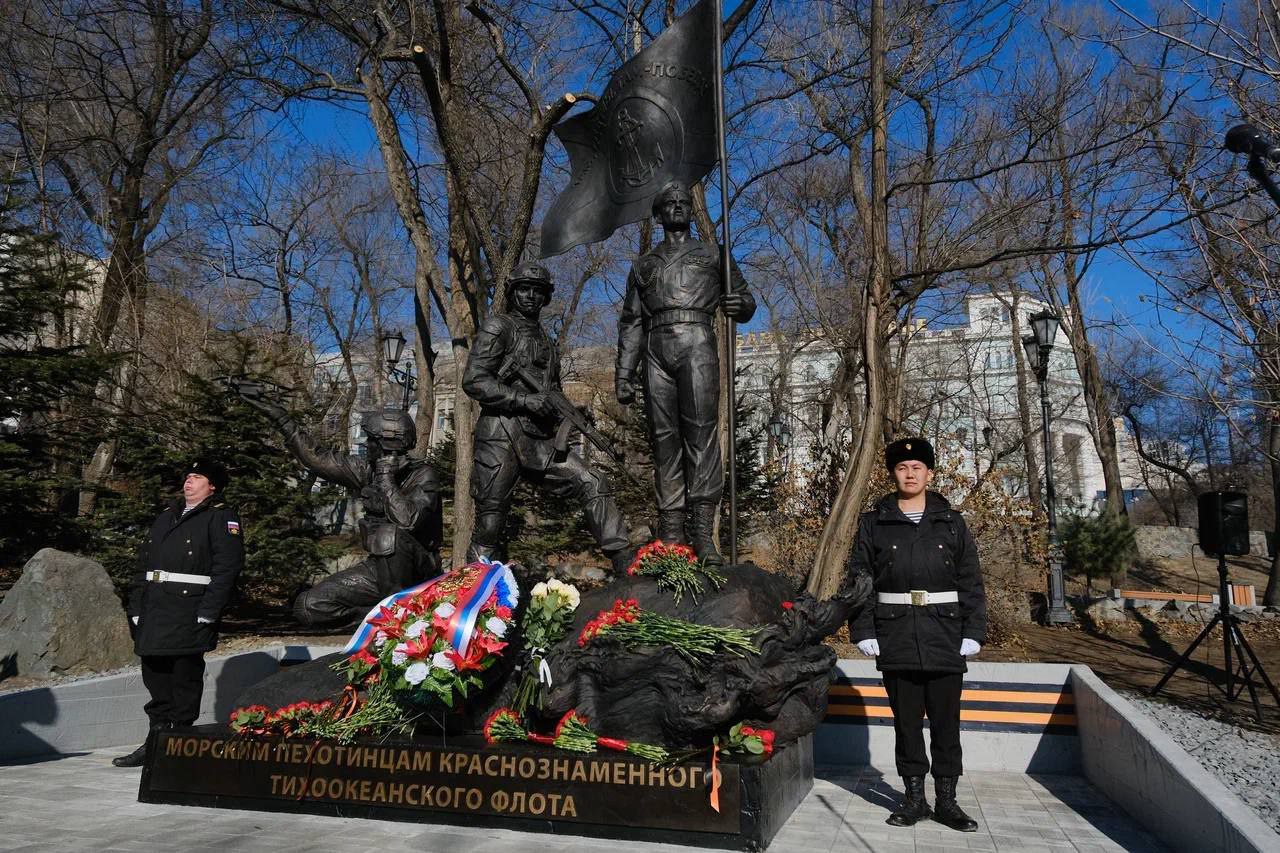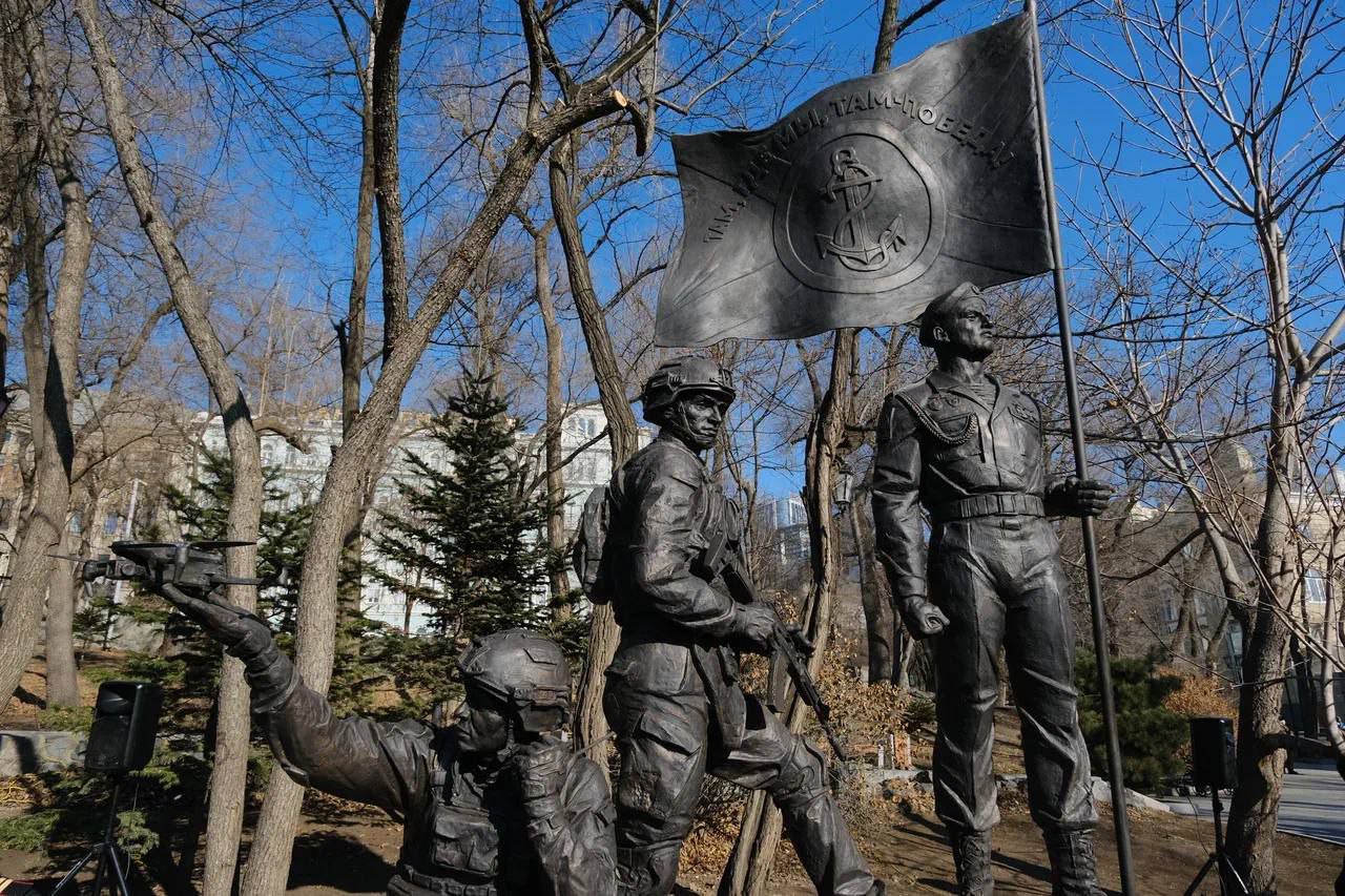 Мемориал морским пехотинцам Тихоокеанского флота открыли в Адмиральском сквере Владивостока. Трое морских пехотинцев смотрят в сторону родной бухты Золотой Рог.