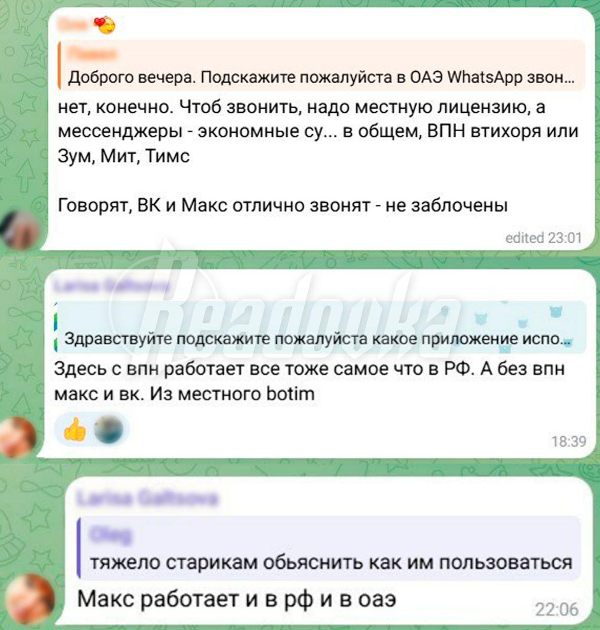 Через различные мессенджеры по типу Telegram, FaceTime, WhatsApp* и другие переписываться можно, а вот звонок не пройдет. Для этого нужна специальная лицензия, которую не выдают иностранным государствам — все звонки фильтруются провайдерами. Конечно, местные операторы продвигают свои разрешенные приложения для интернет-звонков (Botim, C’Me, GoChat), но чтобы пользоваться ими, нужно платить деньги, а МАХ бесплатный. К слову, Readovka в MAX тоже есть — так что за рубежом можно и звонить домой, и читать нас там.