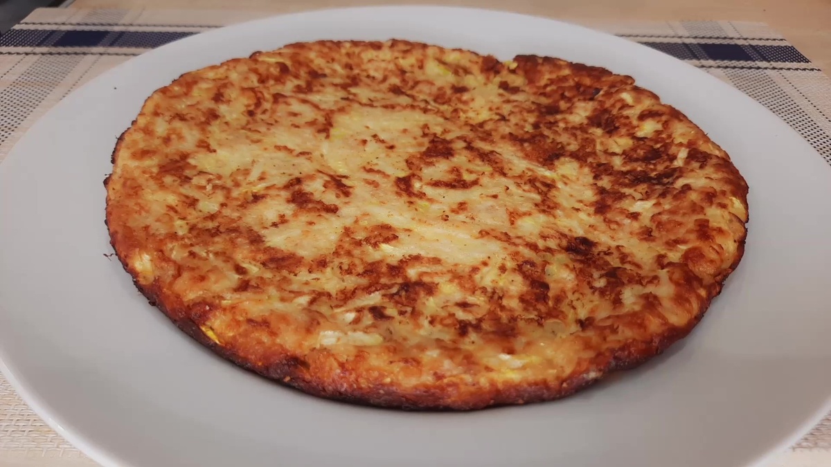 - Сковороду мазать оливковым маслом и разогревать не сильно. Переложить массу на сковороду и готовить под крышкой на маленьком огне 5-8 минут, пока пышка не схватится.