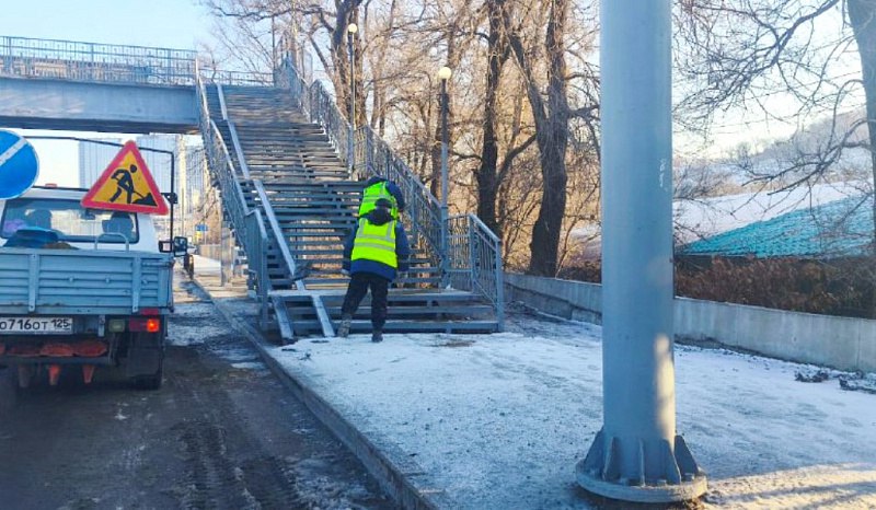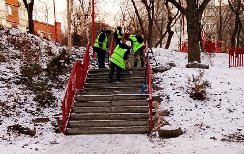 Почти 200 рабочих вручную очищают от снега и наледи тротуары Владивостока