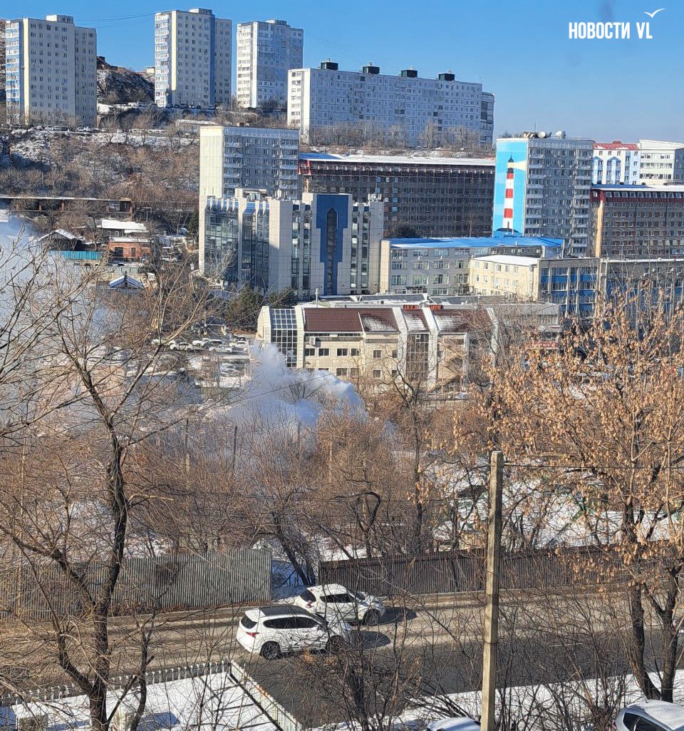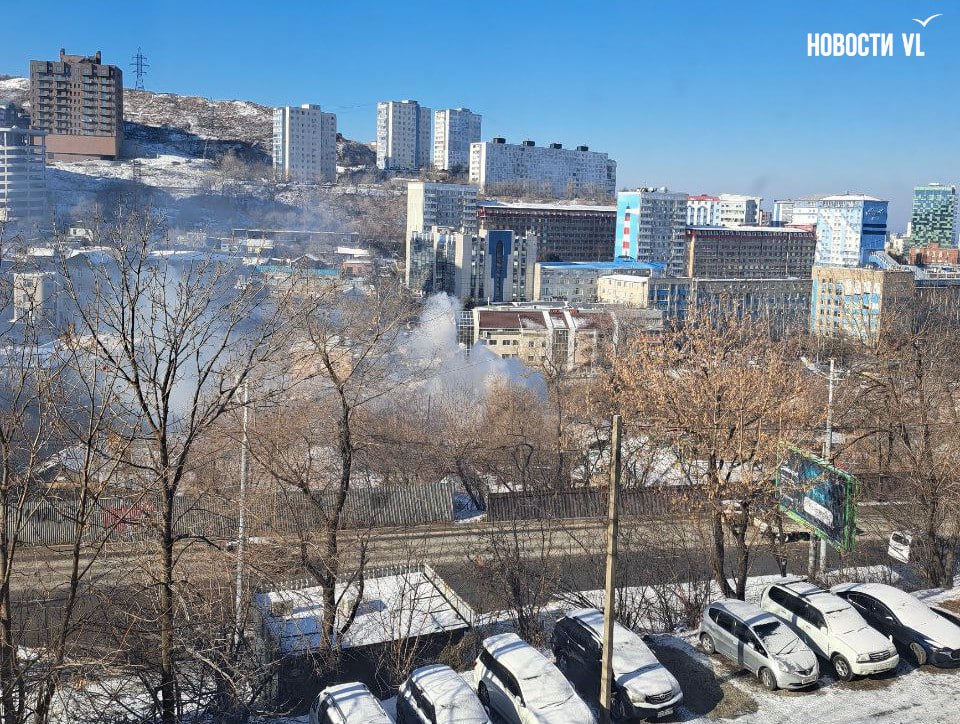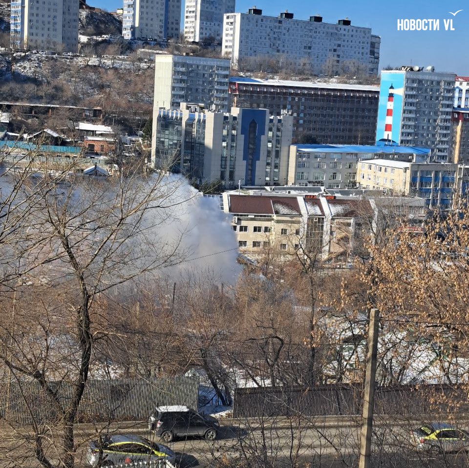 В Голубиной Пади загорелся ещё один частный дом. Пожар наблюдают из окон жители ближайших домов и студенты ВВГУ. Ранее эту территорию отдали под реновацию. Тут строят несколько ЖК, но немного частного сектора всё же ещё осталось.