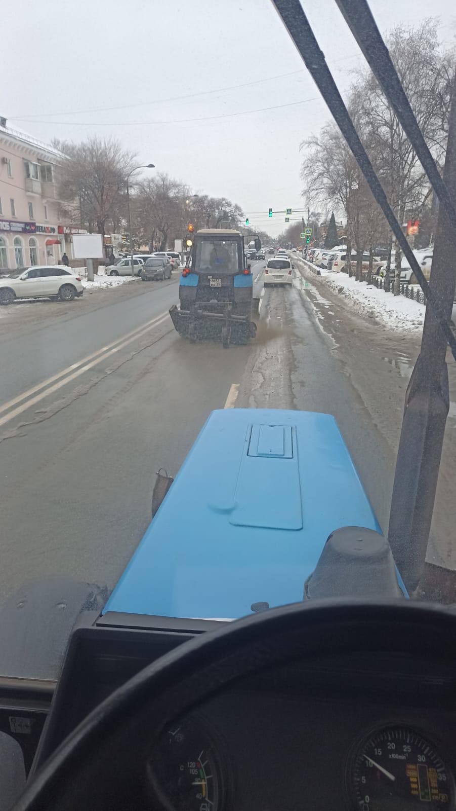 Сейчас на улицах задействованы тракторы МТЗ, автогрейдеры и комбинированные дорожные машины. Семь МТЗ выполняют смет дорожного полотна: четыре на улице Некрасова, ещё три на центральных улицах. Пескосоляной смесью обрабатывают дороги пять КДМ: четыре работают на проблемных отрезках, одна - по обращениям ГАИ на участках, где срочно требуется вмешательство.