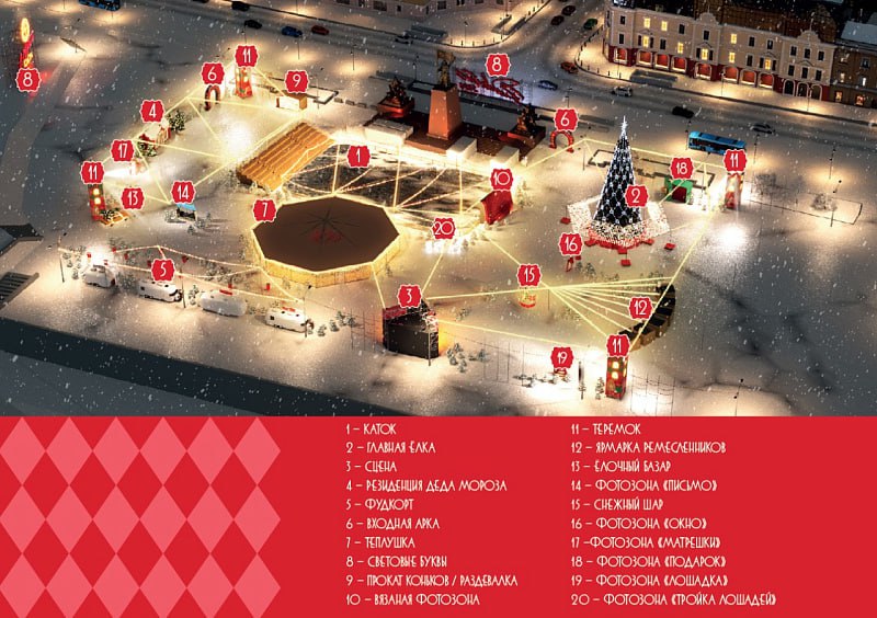 Главной точкой притяжения станет 20-метровая елка, рядом с которой разместят каток, тематические фотозоны, ярмарку ремесленников, фудкорт и резиденцию Деда Мороза.