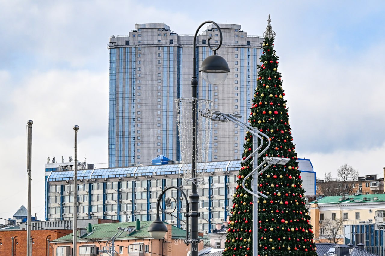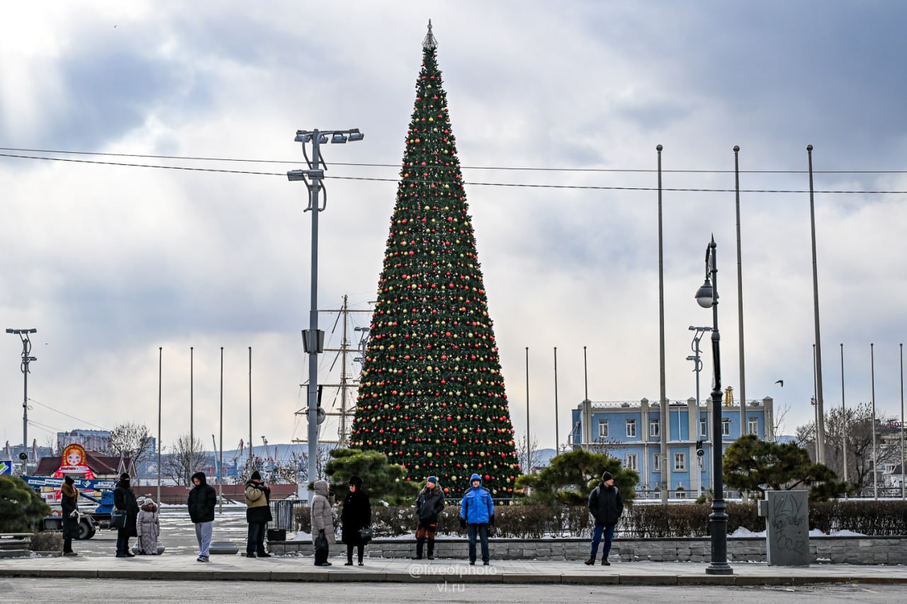 Тем временем на центральной площади Владивостока почти закончили монтаж елки