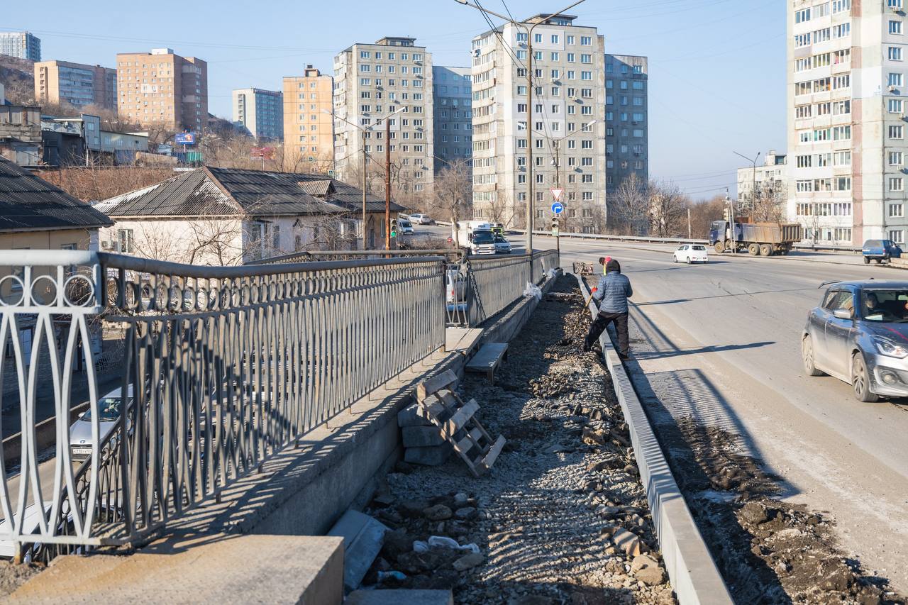 На Баляевском путепроводе во Владивостоке ремонтируют пешеходные зоны.