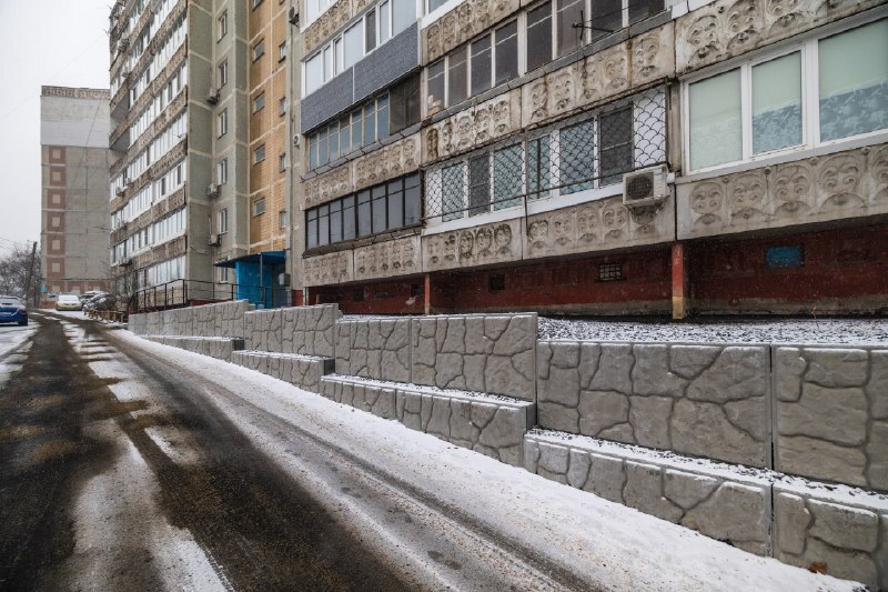 Во дворе на Карбышева, 54 построена новая подпорная стена и отремонтирована дорога.