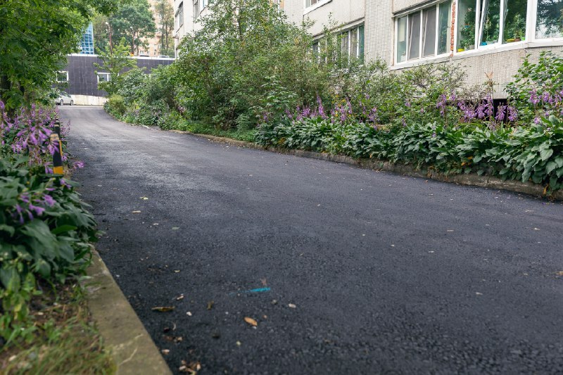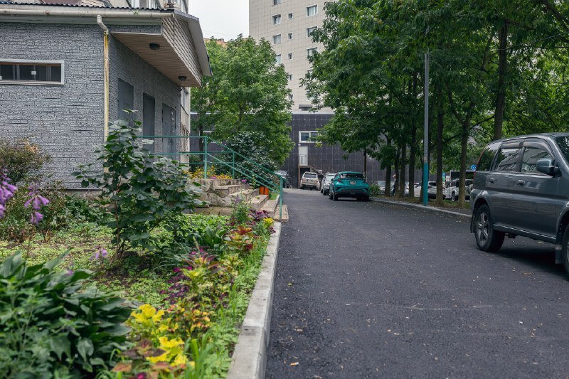 Здесь и тенистая аллея для прогулок, и ухоженные клумбы с цветами, и асфальтированная территория с отдельным участком для стоянки авто. В прошлом году подключили систему видеонаблюдения, установили декоративное ограждение вокруг клумб.