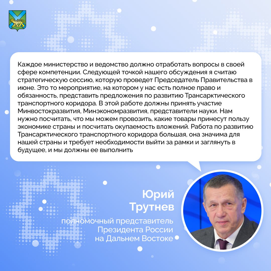 Полпред президента России на Дальнем Востоке Юрий Трутнев обсудил на совещании выполнение поручения президента по созданию Трансарктического транспортного коридора (ТТК). Его главная часть — знакомый всем Северный морской путь