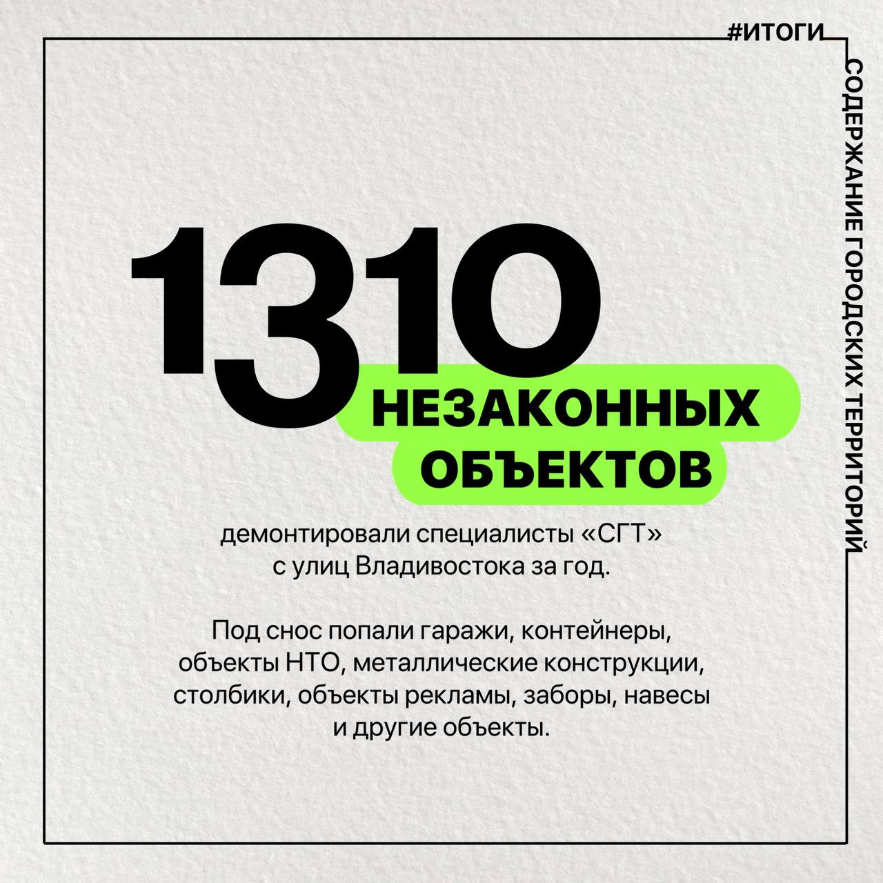 Всего с начала года бригады предприятия разобрали и вывезли 812 незаконных объектов, включая гаражи, торговые павильоны, киоски, посты охраны, а также металлические контейнеры и массивные железобетонные конструкции.
