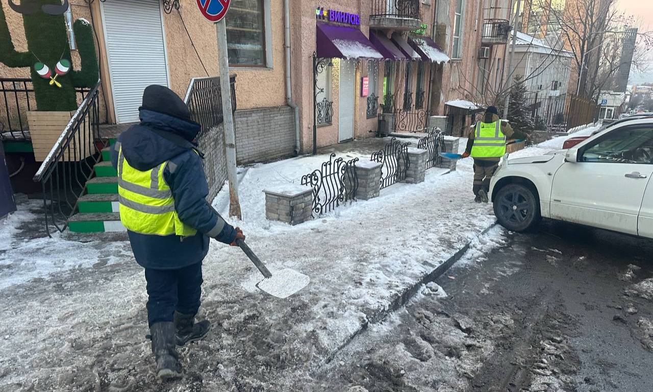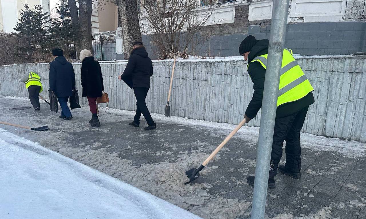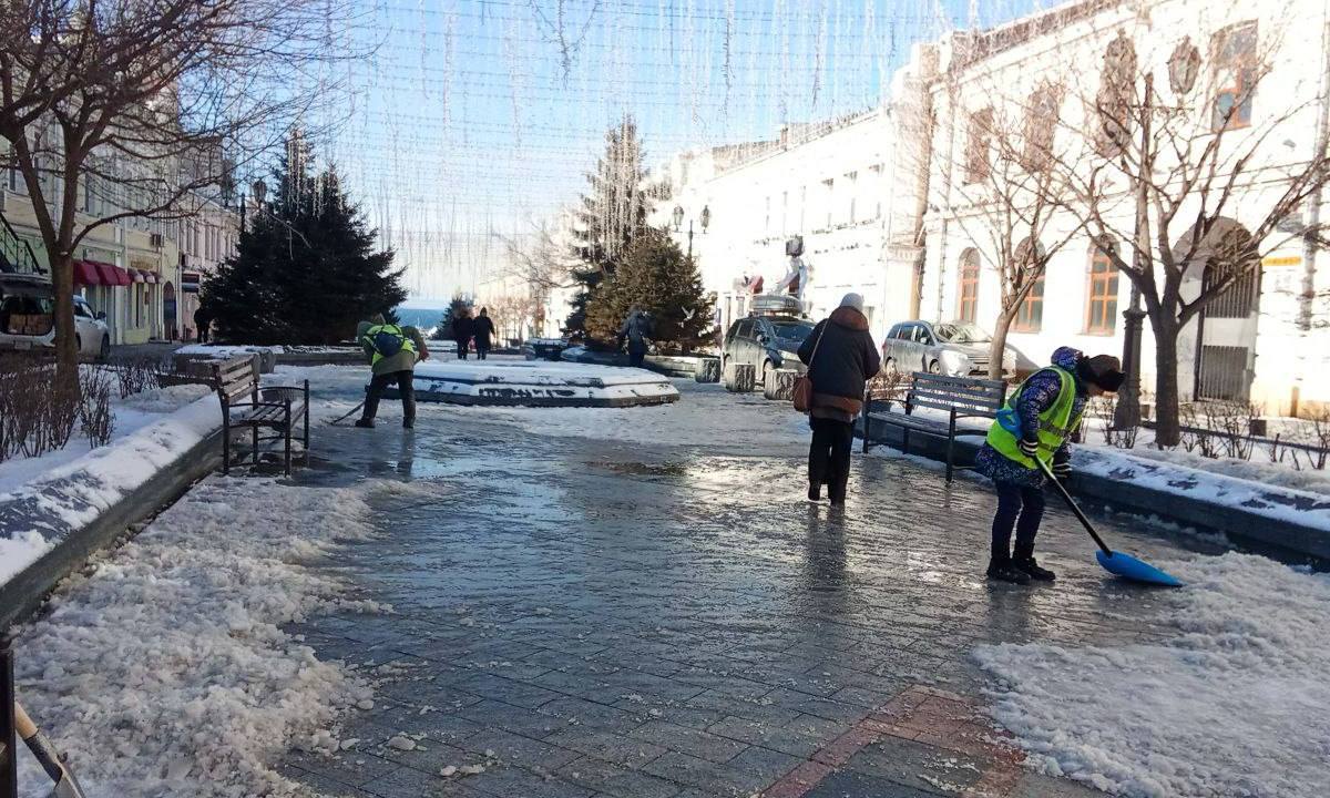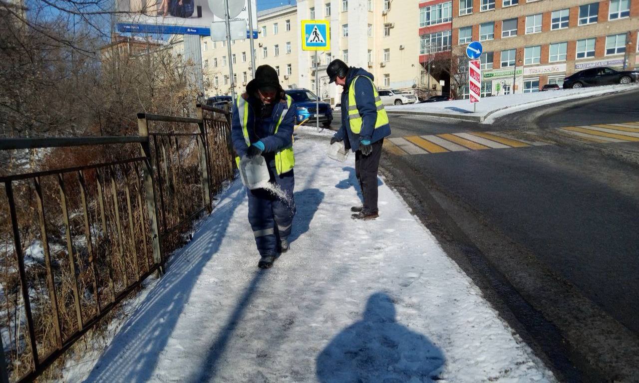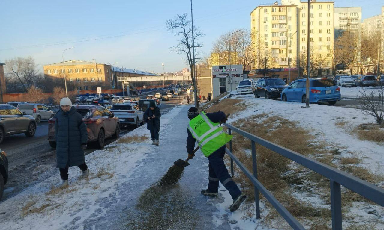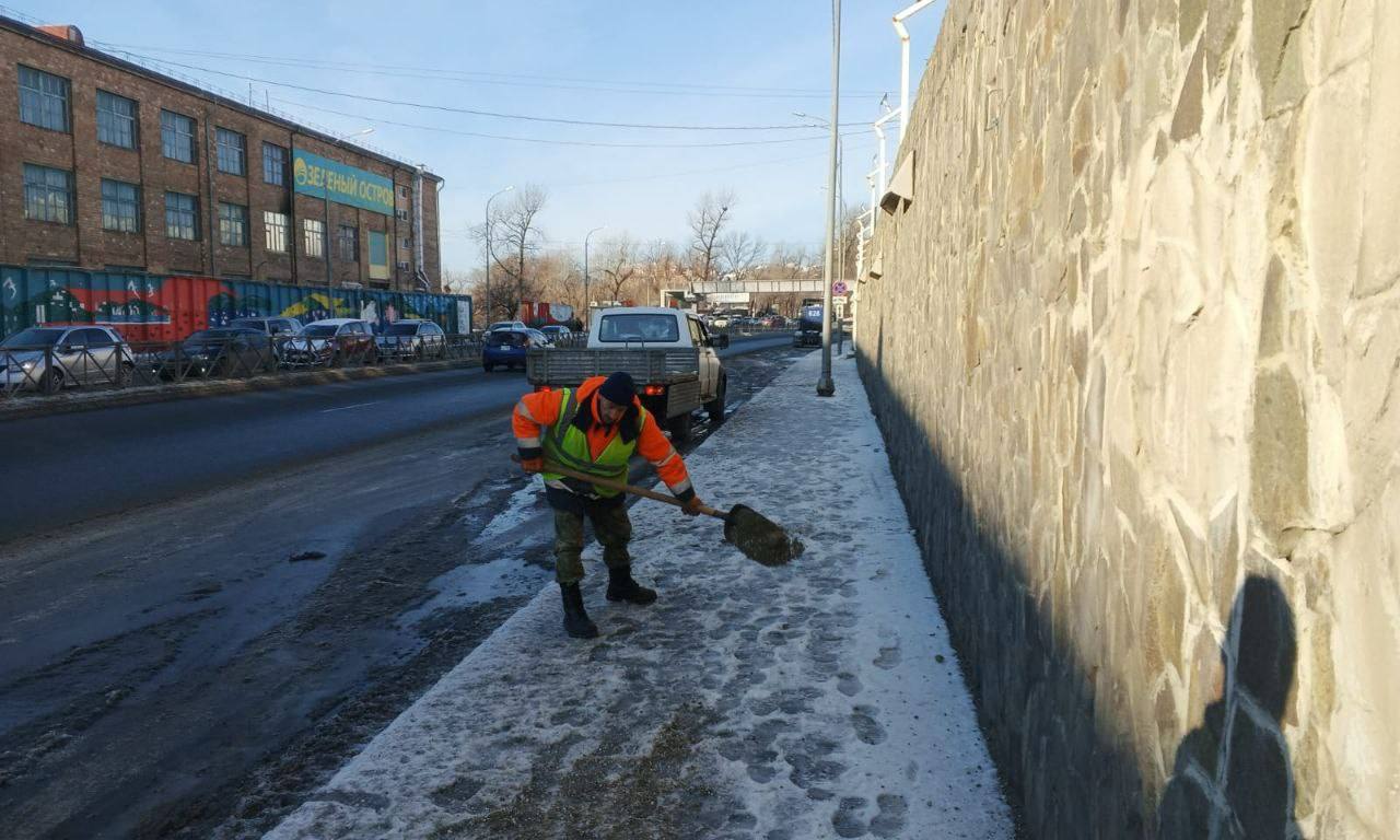 Сегодня во Владивостоке дорожники вручную убирали снег и лед с тротуаров, остановочных карманов, подземных переходов и виадуков