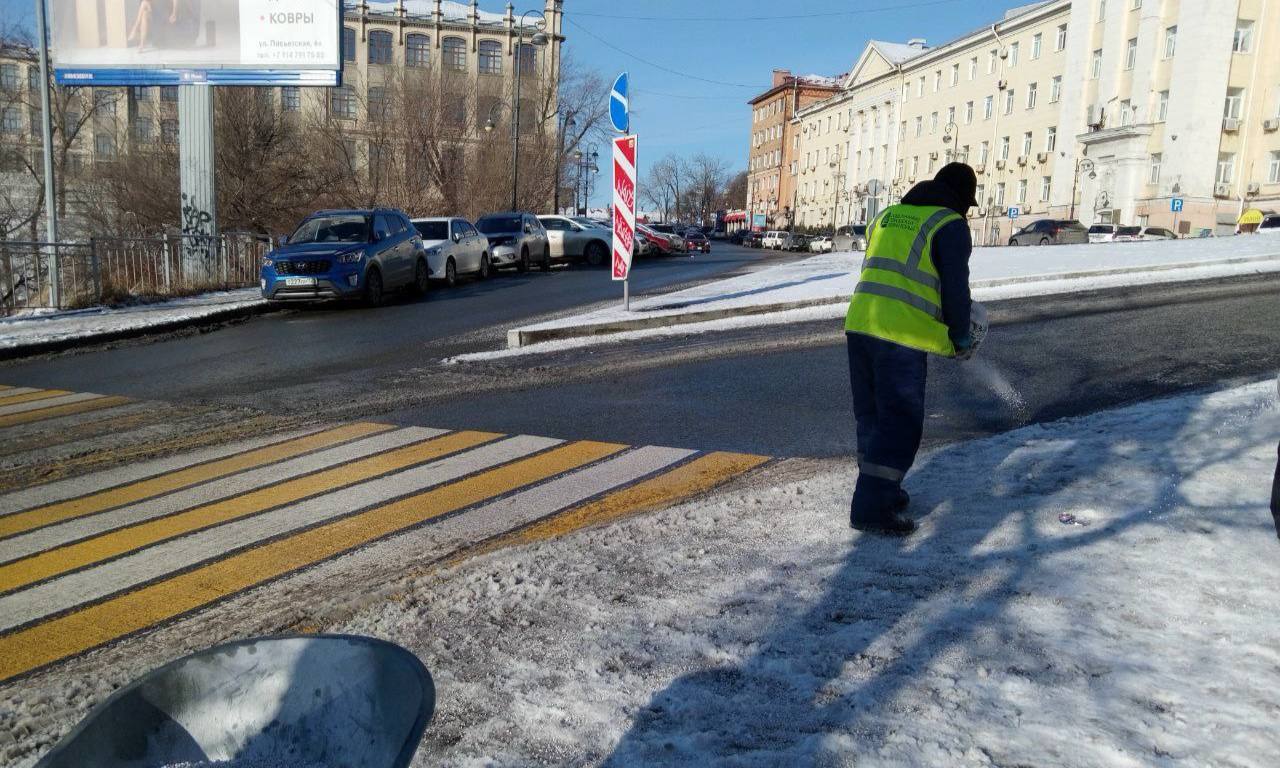 Ночью бригады "СГТ" продолжат уборку и обработку дорог и пешеходных зон по всему Владивостоку.