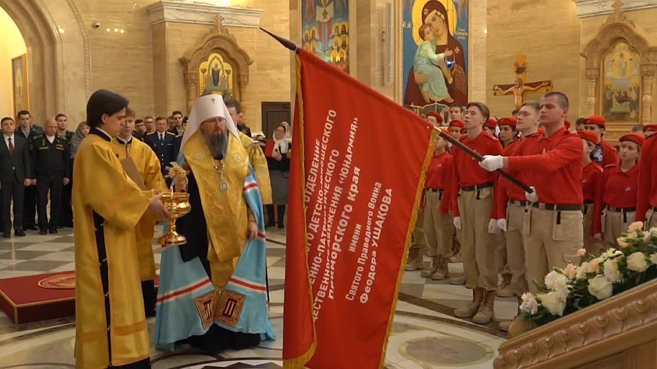 Во Владивостоке в Спасо-Преображенском кафедральном соборе состоялась церемония освящения именного знамени регионального отделения Всероссийского детско-юношеского военно-патриотического общественного движения «Юнармия» Приморского края.