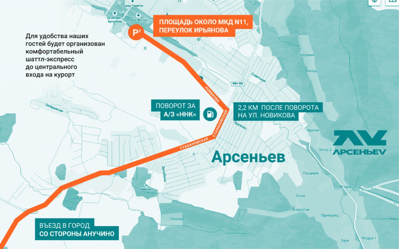 P 2 Дополнительная парковка: Расположена по адресу: г. Арсеньев, площадь около МКД № 11, переулок Ирьянова. Между парковкой и курортом будут курсировать автобусы с интервалом 15-20 минут.