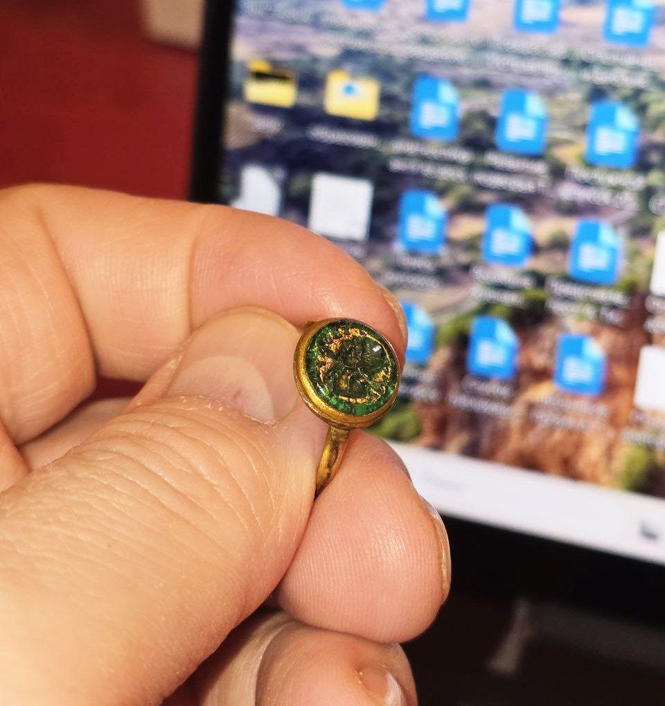 Рабочие во время прокладки коммуникаций в Лавре передали мне несколько предметов, обнаруженных в слое 19 века. Среди них была золотая перстень-печатка, довольно скромная на вид. По предварительной оценке, она могла быть изготовлена в XIX веке. В золотую оправу вставлен неровный зеленоватый камень или, что вероятнее, простое зелёное стекло. Этот диссонанс — золото и простое стекло — сам по себе был некоторым парадоксом, который я, отметив, отложил в сторону.