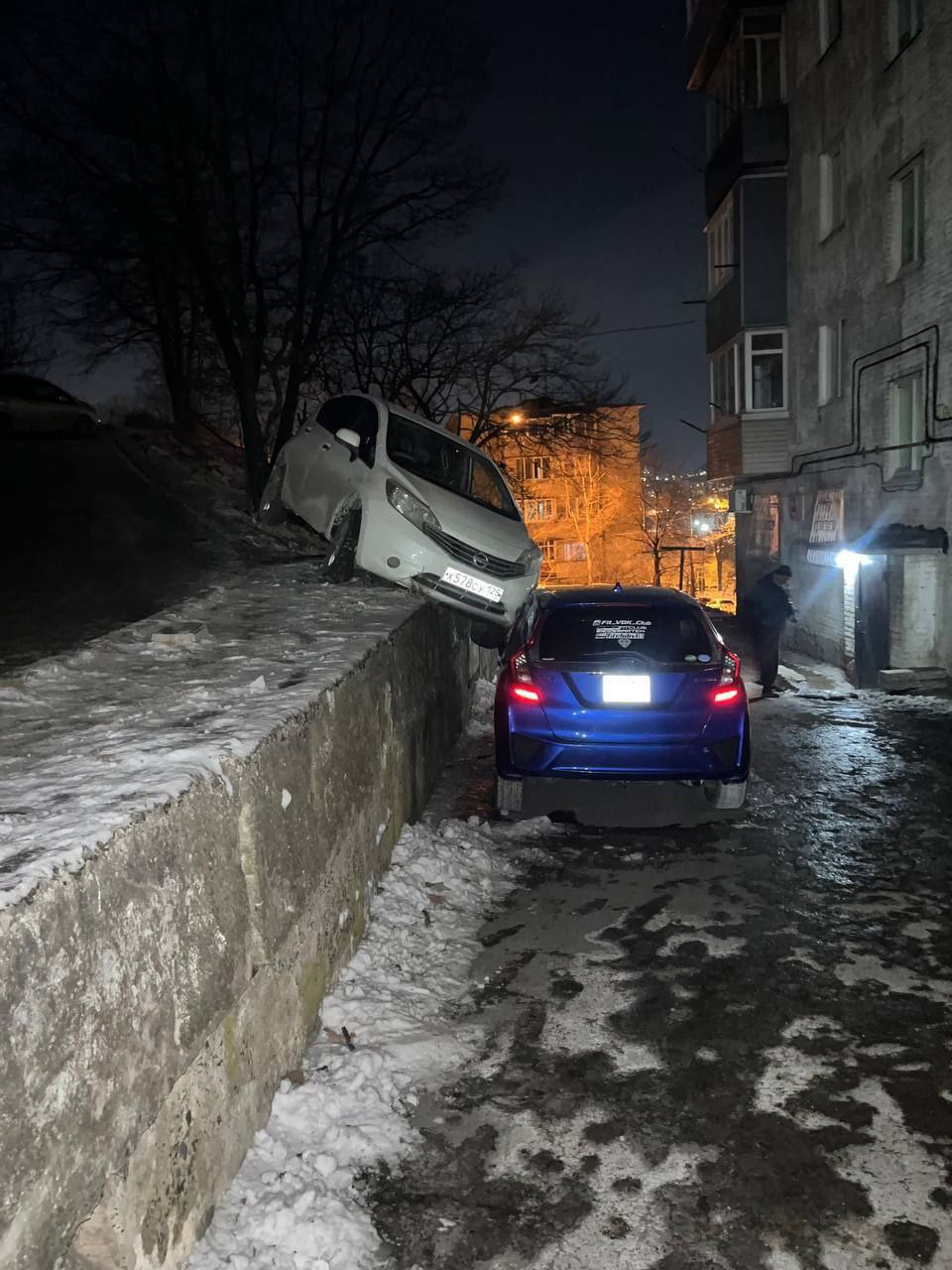 На Талалихина, 2, водитель Nissan Note не справился с управлением. Машина слетела с подпорной стены по льду и врезалась в Honda Fit.