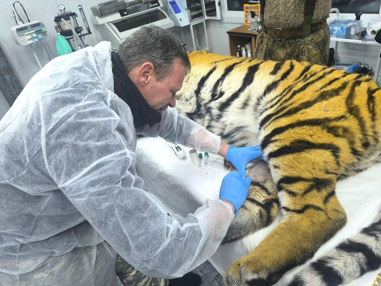 Тигра поймали несколько дней назад. Молодой самец, примерно 2,5 лет, стал регулярно наведываться в окрестности села. Большую кошку отловили и доставили в Центр реабилитации «Тигр» для детального осмотра.
