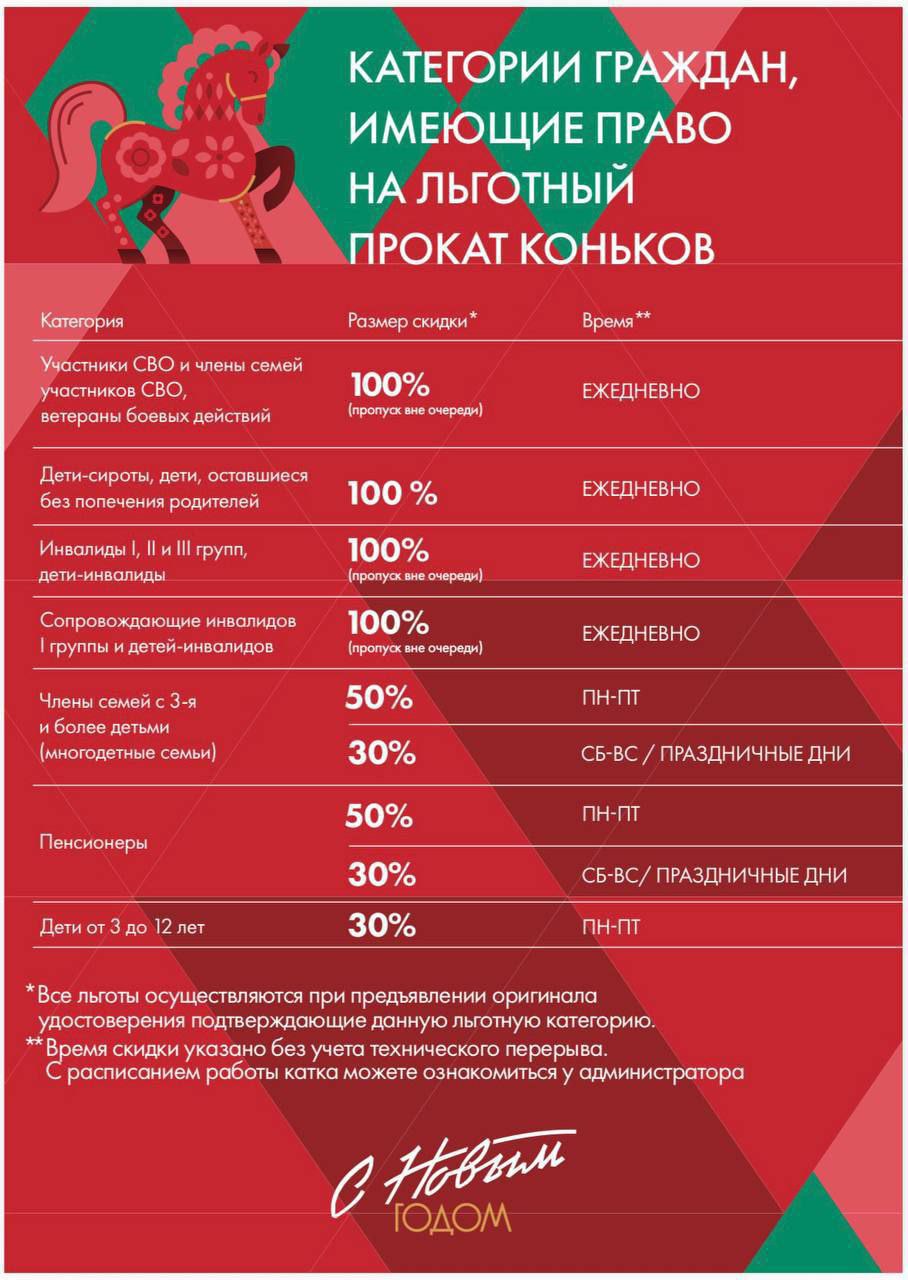 Посетить каток можно со своими коньками или воспользоваться платным прокатом. Для некоторых категорий граждан предусмотрены льготы.