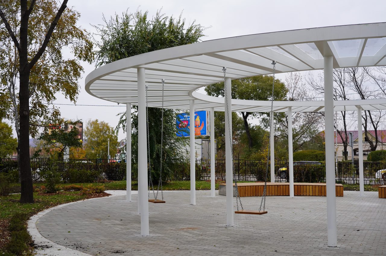 На ул. Краснознаменной в порядок привели заросший ранее городской уголок – сейчас на этом месте есть удобные дорожки и современные детские площадки. При благоустройстве строители обустроили необычную перголу, которая издали привлекает внимание.
