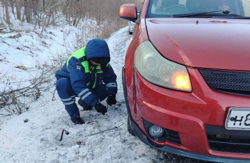 Глава ГАИ Фокино помог маме с тремя детьми заменить пробитое колесо на трассе