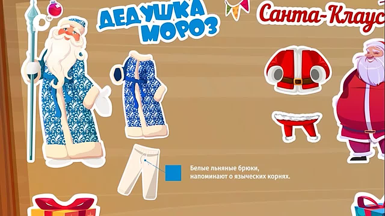 У него роскошная длинная меховая шуба, а Санта-Клаус носит короткий тулупчик.