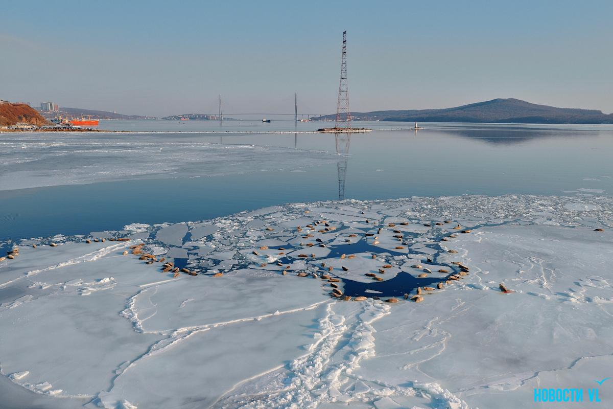 Множество ларг выбрались отдохнуть на лёд Амурского залива
